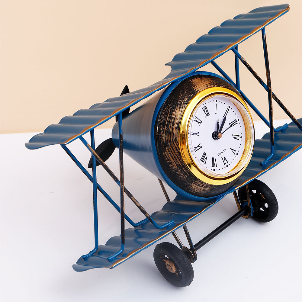 Add a touch of vintage charm to your space with this Vintage Airplane Table Clock. Crafted in the shape of a classic biplane, this unique timepiece doubles as a decorative showpiece, making it a perfect addition to your living room, office desk, or study. The bright metal frame with golden detailing enhances its retro appeal, while the functional clock at the center keeps you punctual in style. Ideal for gifting or personal décor, this clock is both practical and artistic.