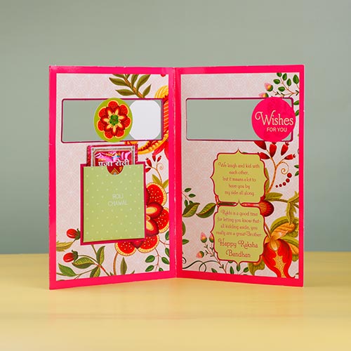 • Neat packaging: Securely holds Rakhi and roli-chawal inside the card.