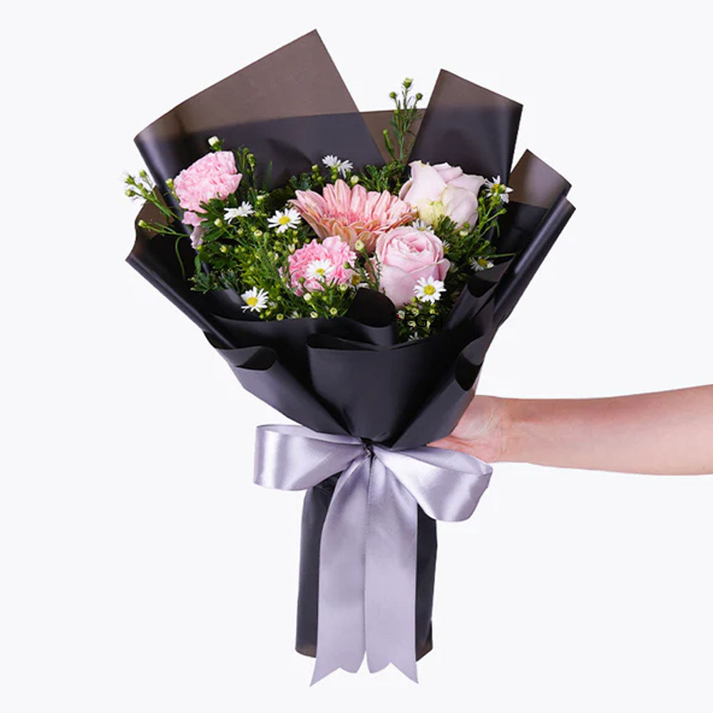 A bouquet of pink roses, pink gerbera daisies, and pink carnations would create a soft, feminine, and cheerful arrangement. The pink roses, with their elegant, layered petals, symbolize gratitude, grace, and admiration, adding a refined touch. The bright, daisy-like pink gerberas, with their wide petals and cheerful nature, bring a playful and vibrant energy to the bouquet, symbolizing happiness and innocence. The pink carnations, with their ruffled texture and full-bodied blooms, add a sense of charm and warmth, representing love and appreciation. Together, the various shades of pink create a harmonious, sweet, and uplifting bouquet that is perfect for expressing affection, admiration, and joy. It would be ideal for celebrations, gifts, or as a bright, happy centerpiece.