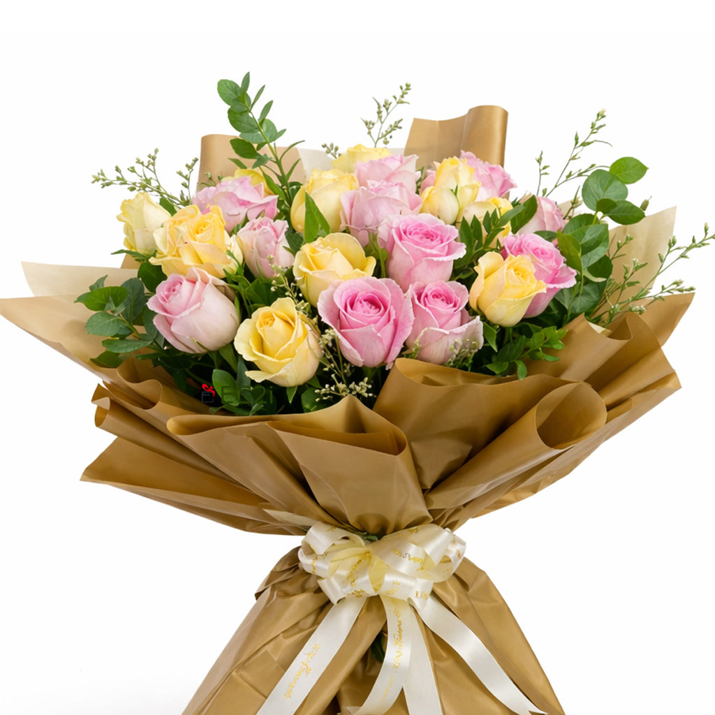Round Boquuet of 20pcs Pink and Peach Roses with Greenary Brown paper wrapping with White ribbon bow.