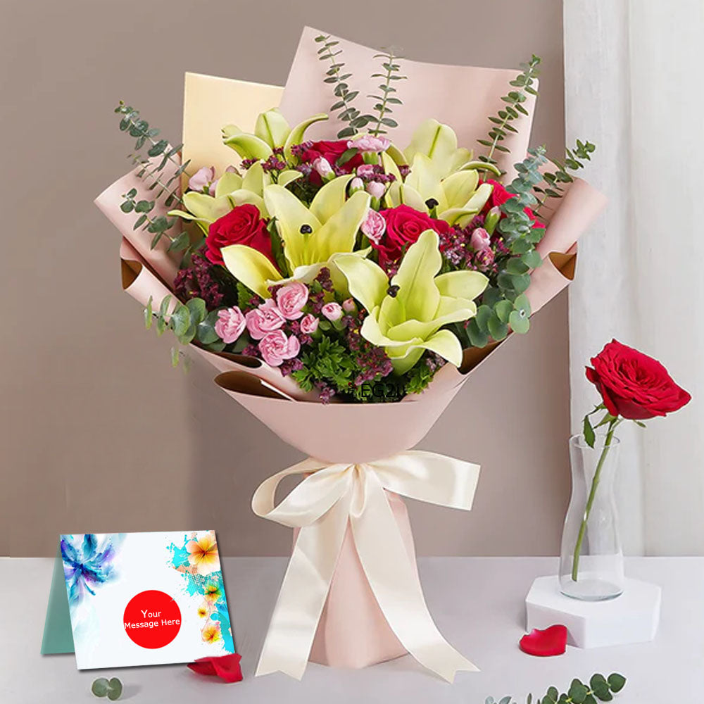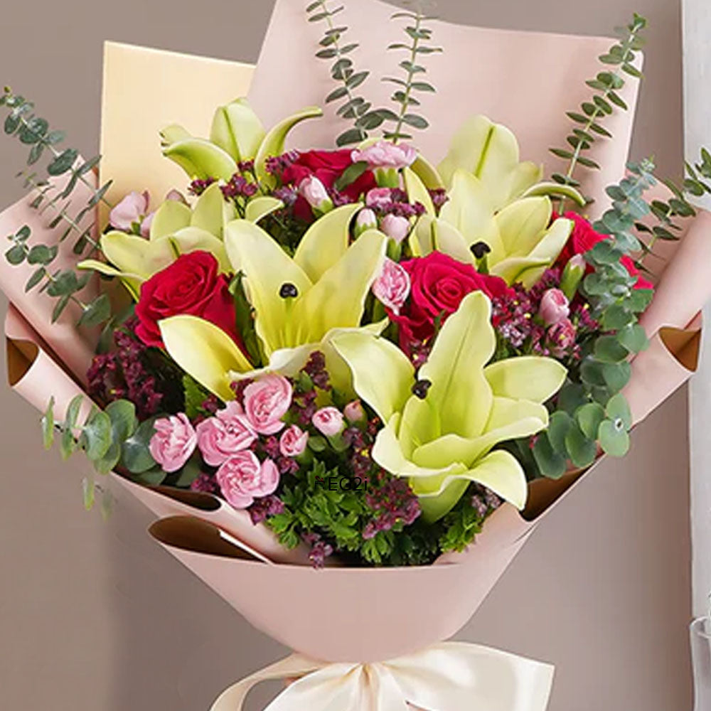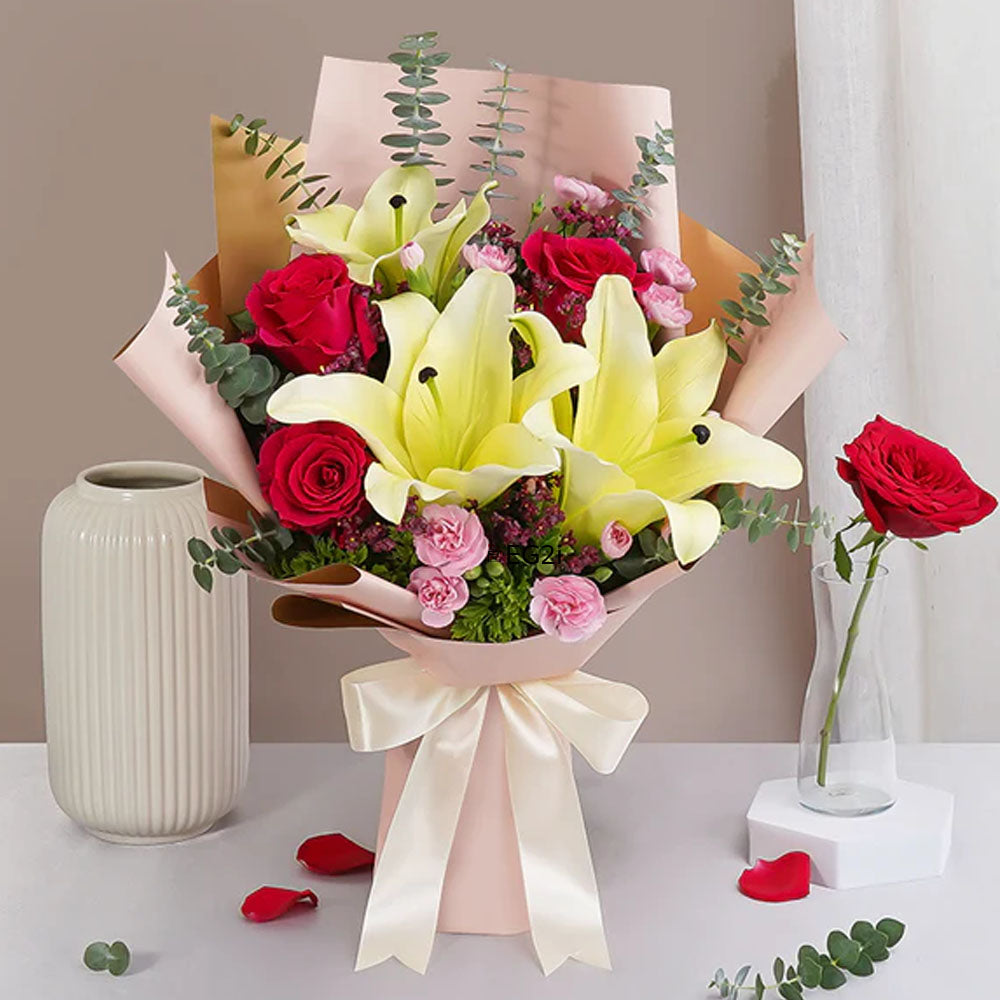 A bouquet featuring lilies, roses, and carnations would create a stunning and fragrant arrangement. The lilies, with their elegant and large blooms, add a touch of sophistication and purity. The roses, symbolizing love and beauty, bring a timeless charm, adding depth and a romantic feel. Carnations, known for their frilled edges and long-lasting nature, would fill the bouquet with their full, rounded blooms, enhancing the texture and balance of the arrangement. Together, these flowers would create a harmonious and vibrant bouquet, offering both visual beauty and a delightful fragrance. Send This Exclusive Bouquet anywhere in India for his/her birthday, anniversary, Valentine's Day, Mother's Day or any other occasion.