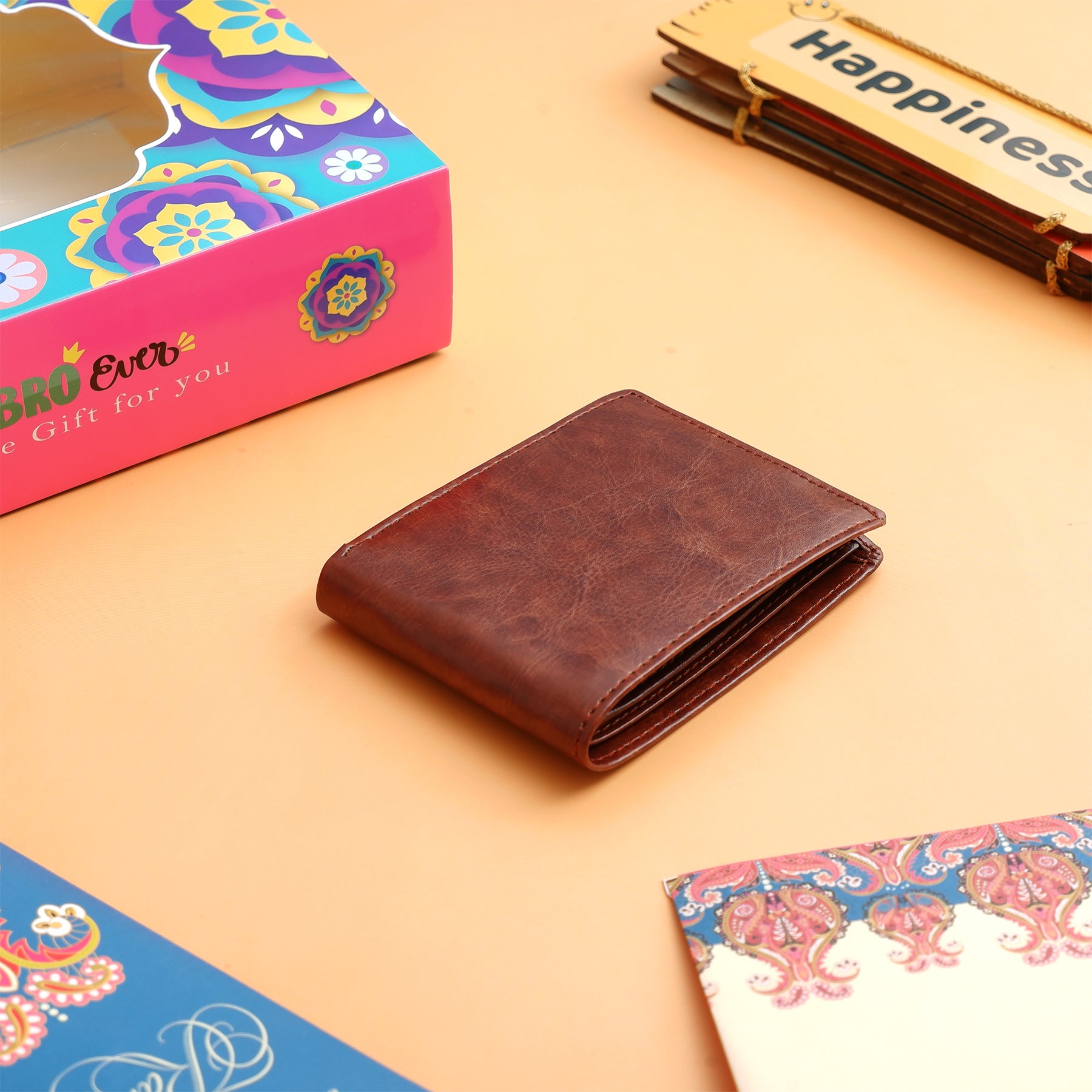 • A Beautiful Rakhi Mailer along with Premium Finish Wallet and a Heartfelt Quoted Hanging.