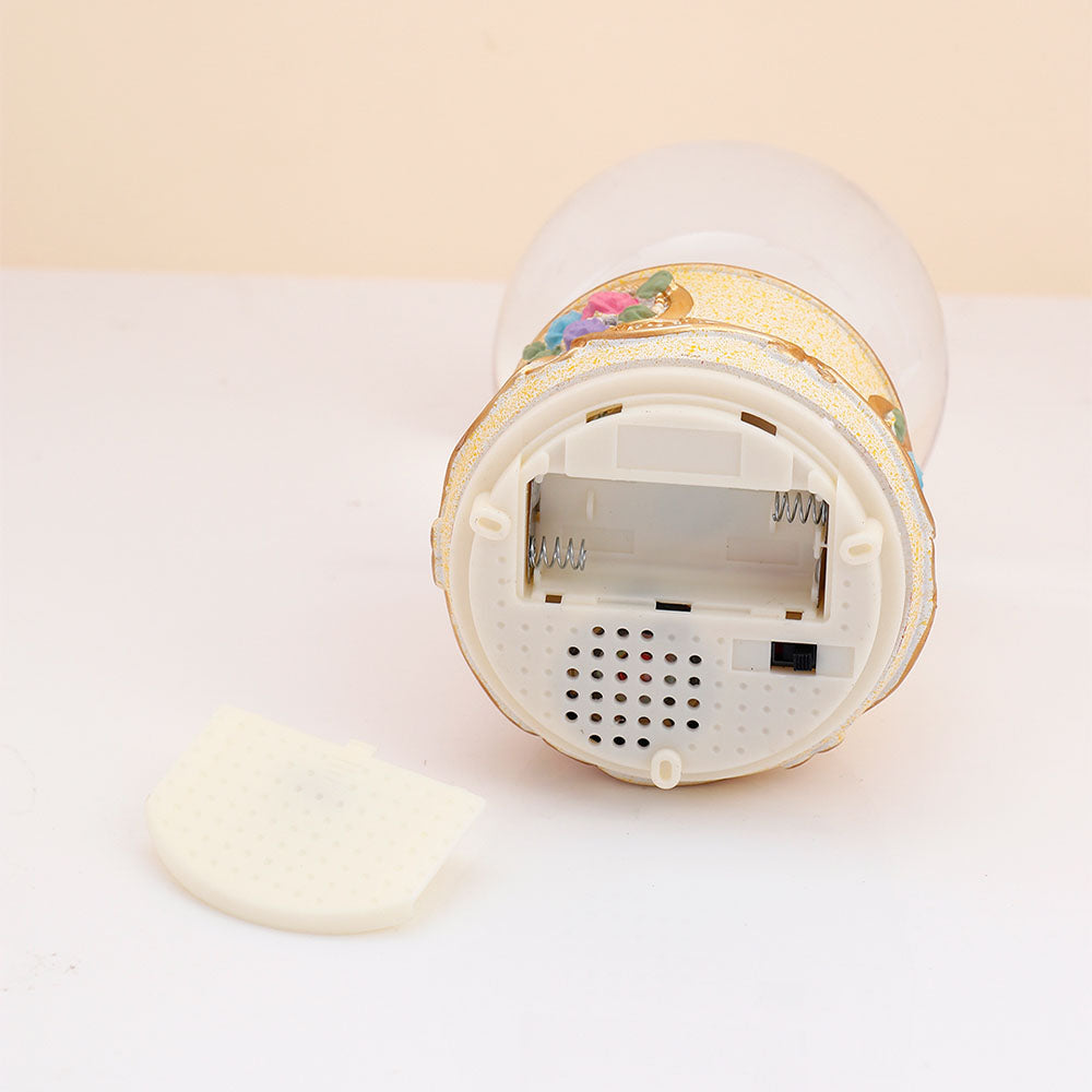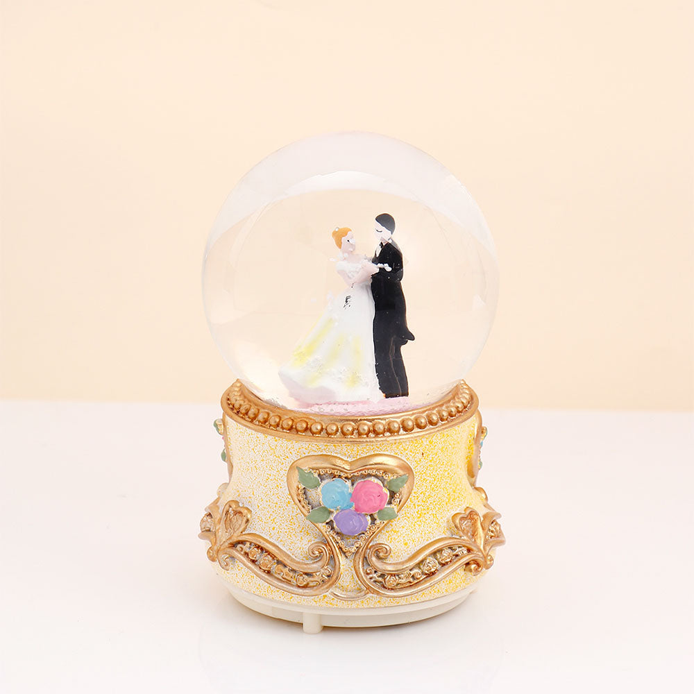 Celebrate eternal love with this enchanting musical snow globe featuring a romantic couple. This mesmerizing decorative piece combines elegance and nostalgia, with delicate snowflakes swirling around the couple figurines as they play a beautiful melody. The ornate golden base, adorned with floral motifs and sparkling details, adds a touch of luxury to any space. Perfect as wedding anniversary gifts for couples, romantic gifts for wives, or anniversary gifts for husbands. An ideal choice for anniversary gifts for her or him, this snow globe creates magical moments. Available for online gift delivery across India.