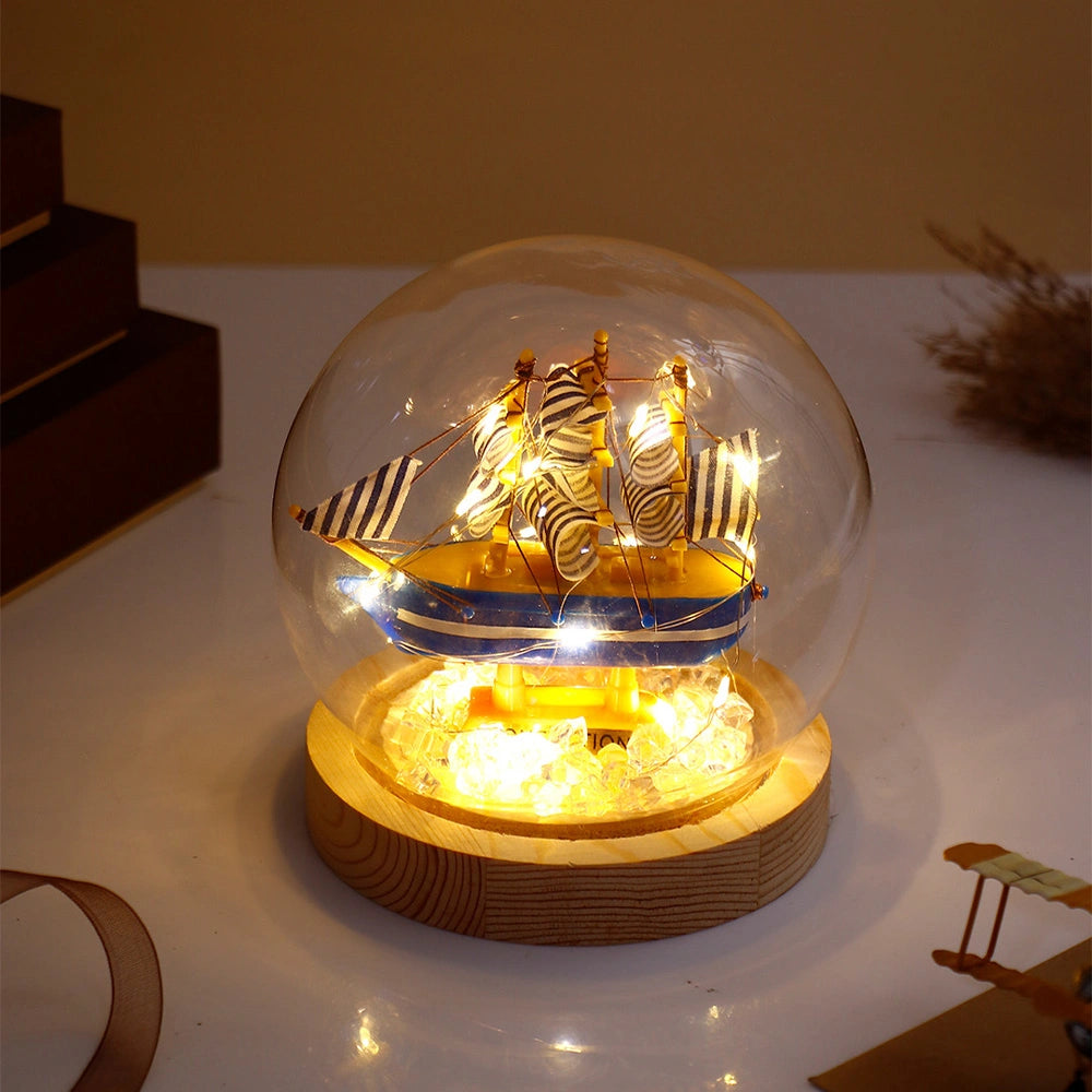 Transform any space into a dreamy nautical escape with this enchanting Miniature Sailing Ship Glass Dome LED Night Light - a perfect fusion of art, elegance, and warm ambient lighting. Encased in a crystal-clear glass dome, this beautifully crafted miniature sailing ship sits gracefully on a bed of sparkling crystal pebbles, illuminated by delicate LED fairy lights that create a magical warm glow all around. Whether placed on a bedside table, study desk, living room shelf, or office space, this stunning decorative piece instantly elevates the ambience of any room with its timeless nautical charm. Each piece rests on a beautifully crafted wooden base that adds a warm, natural elegance to the overall design. This exquisite glass dome night light makes a thoughtful and memorable gift. A perfect gift for loved ones.