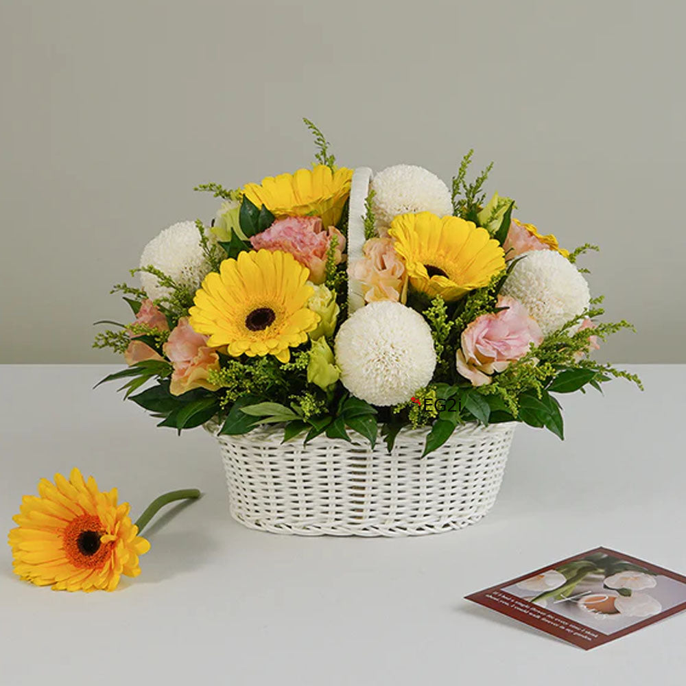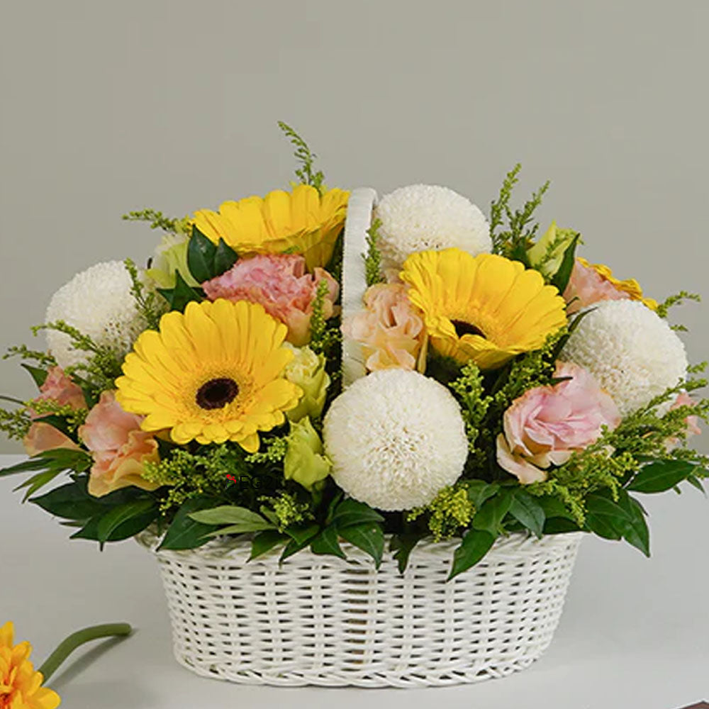Basket arrangement featuring gerberas, carnations, and chrysanthemums in vibrant colors, accented with lush greenery. Send This Exclusive Basket of Flowers anywhere in India for his/her birthday, anniversary, Valentine's Day, Mother's Day, or any other occasion.