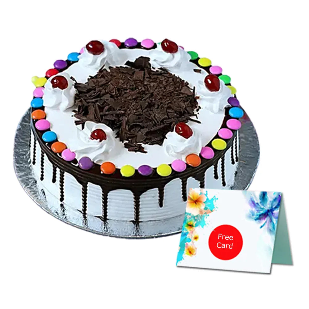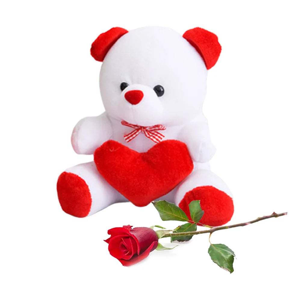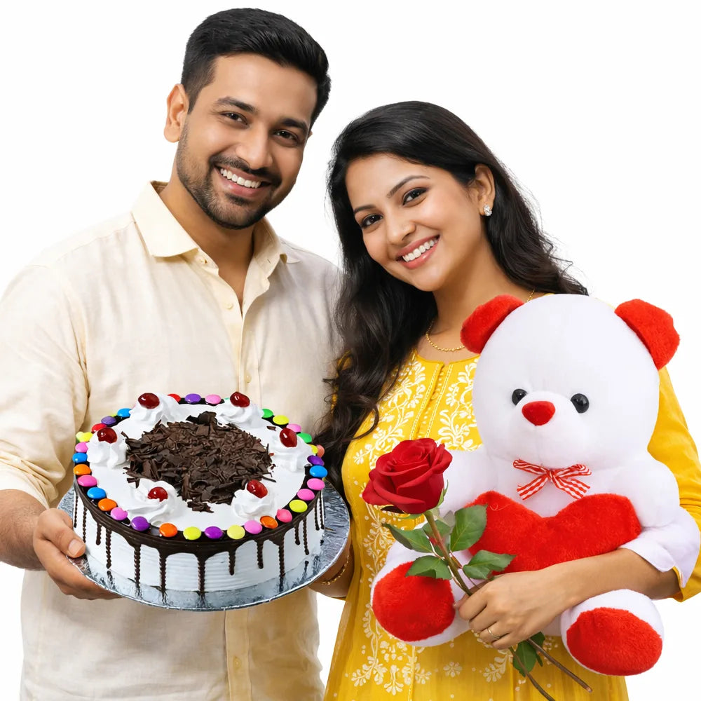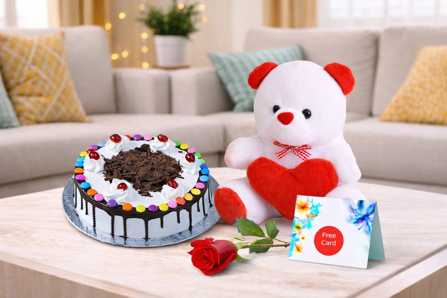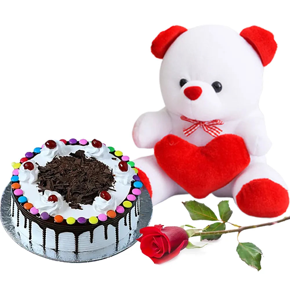 Product Details:: Single Rose and Cake and Teddy Bear. 500gm Black Forest Gems Cake. Soft Toys 6inch. Free Single Red Rose. Free Knife. Free On... Read More