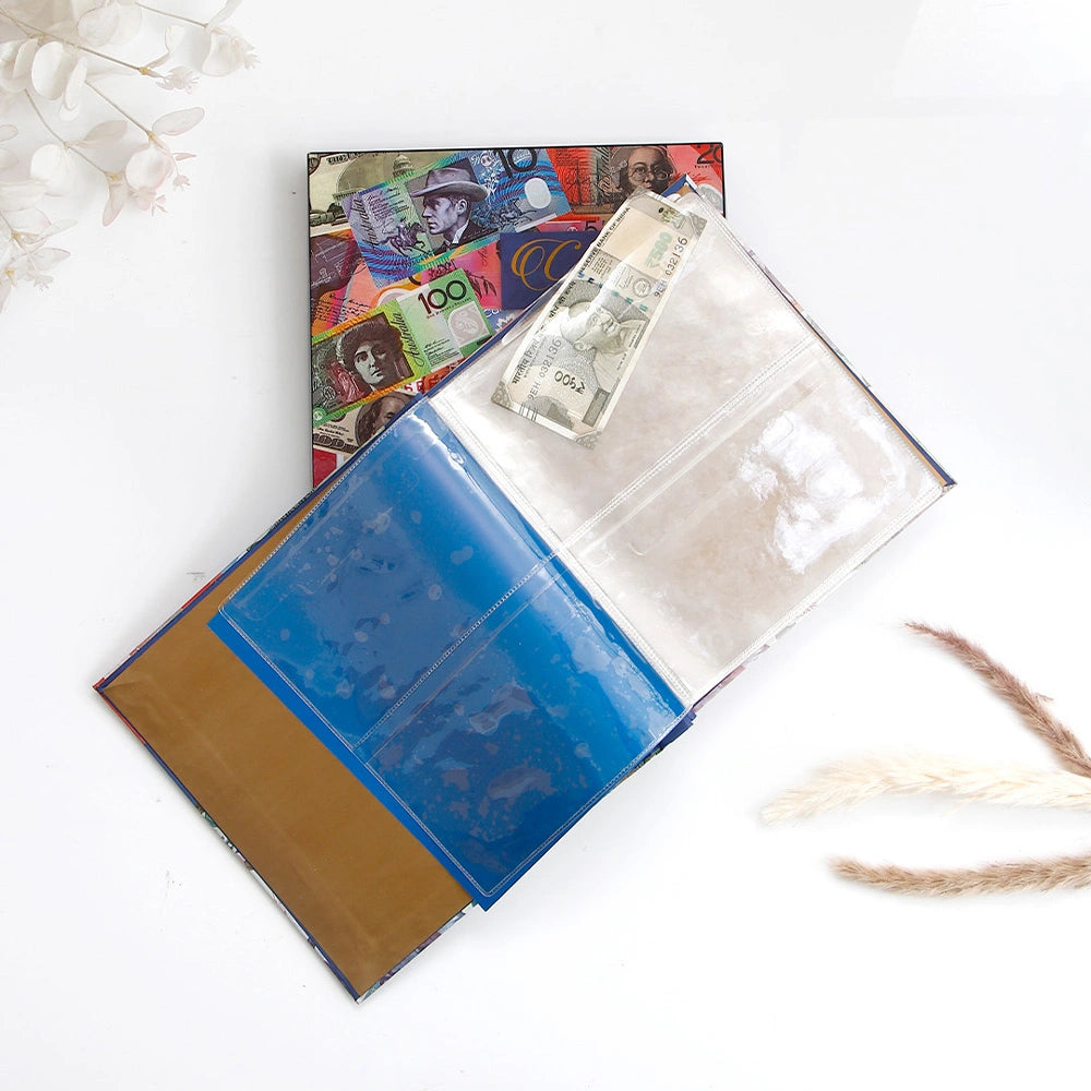Professional currency note collection album designed for banknote collectors and enthusiasts. With 10 pages and 4 pockets per page (size: 19 x 11 cm), this album provides secure storage for currency notes of various sizes. Measuring 25 x 24 x 3 cm and weighing 600g, it's built with quality materials to protect your collection from wear and environmental damage. The transparent pockets allow easy viewing while keeping notes flat and protected from creases, tears, and discoloration.