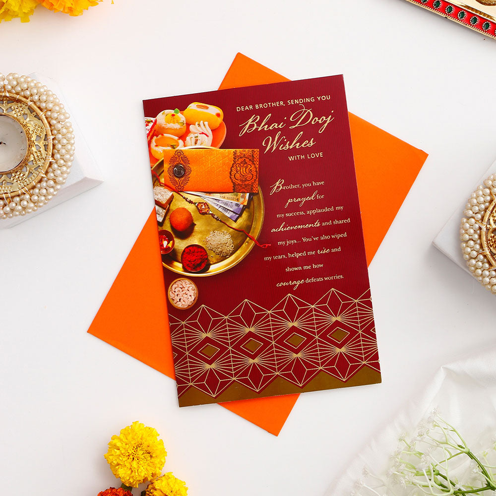 • Bhai Dooj Special Greeting Card - Beautifully designed card with Bhai Dooj motifs and traditional elements.