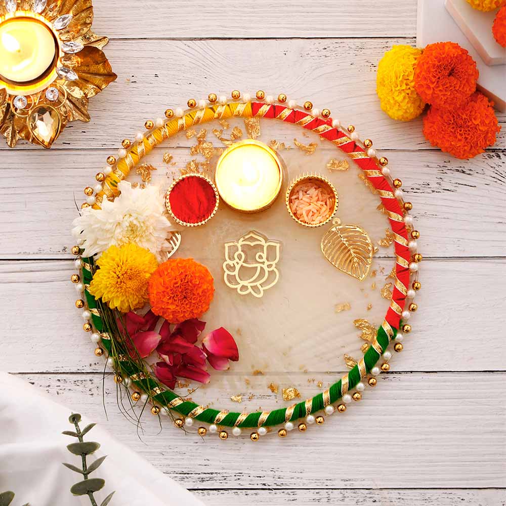 Bring a touch of tradition and elegance to your rituals with our beautifully crafted Designer Pooja Thalis. Each thali is thoughtfully designed with intricate detailing, vibrant colors, and auspicious motifs like Om or Ganesh to enhance your spiritual experience. Decorated with premium materials such as satin ribbons, pearls, beads, and golden accents, these thalis are perfect for festive celebrations, daily rituals, or gifting loved ones on special occasions. Whether used for Diwali, Raksha Bandhan, Karwa Chauth, Navratri, or weddings, these thalis provide a complete devotional setup, making every ceremony more graceful and memorable.