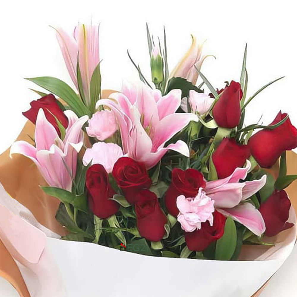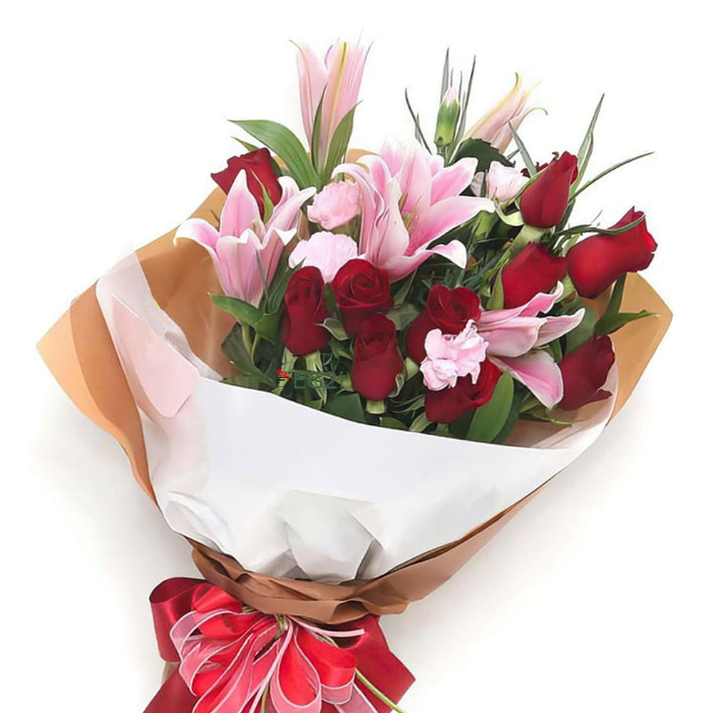The combination of red roses, Pink carnations, and pink lilies makes for a stunning bouquet, perfect for expressing love, admiration, and joy. The deep red roses symbolize passionate love and respect, while the delicate pink lilies add a touch of elegance and beauty. Together, they create a harmonious and visually appealing arrangement, ideal for romantic gestures, anniversaries, or special occasions like weddings. Birthday, Valentine's, Mother's Day etc.