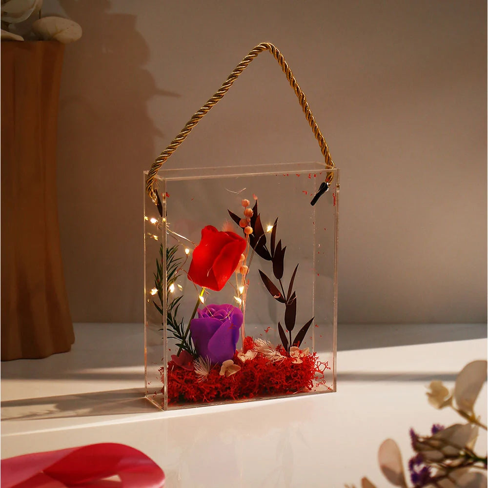 Transform any space into a romantic sanctuary with our enchanting LED floral display boxes, the perfect Valentine's gift for a girlfriend or a wife. These stunning transparent acrylic frames feature beautiful artificial roses, decorative elements, and warm LED fairy lights, creating a mesmerizing display that combines the timeless beauty of Valentine's roses with modern elegance. Each piece is carefully handcrafted with artistic arrangements of flowers, foliage, and decorative accents, making them ideal as Valentine's Day gifts. The convenient golden twisted rope handle allows you to hang these beauties on walls or doors or display them on shelves and tables as captivating centerpieces. The LED lights add a magical glow that makes these pieces stunning both day and night, making them exceptional romantic birthday gifts for him to give her or a thoughtful gift for loved ones on any special occasion.