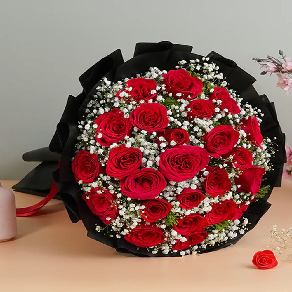 • Round bunch of 12pcs Red Roses with Green Fillers, Black Paper with Red Ribbon bow.