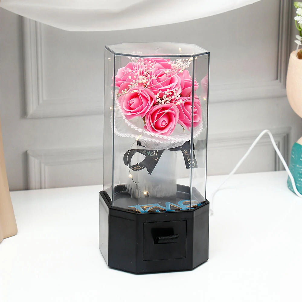 Celebrate your eternal love with this stunning LED-illuminated rose bouquet display featuring vibrant artificial roses and a golden "LOVE" inscription, making it the perfect Valentine's gift for a girlfriend or a wife. This enchanting display showcases a beautiful arrangement of red artificial roses with white accent flowers, elegantly preserved in a hexagonal transparent acrylic case with a sleek black base. The built-in LED fairy lights create a magical, warm glow that illuminates the roses and the prominent "LOVE" message, making it one of the best Valentine's gifts for expressing your deepest feelings. Perfect as a Valentine's gift for her, a special gift for a girlfriend, a special gift for a wife, the first Valentine's gift for a boyfriend to give, or a Valentine's Day gift for a wife, this romantic display combines Valentine's roses with modern LED technology for an unforgettable presentation.