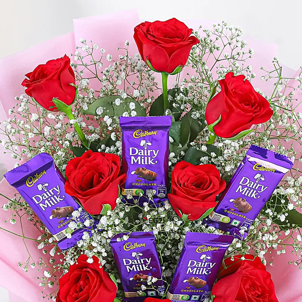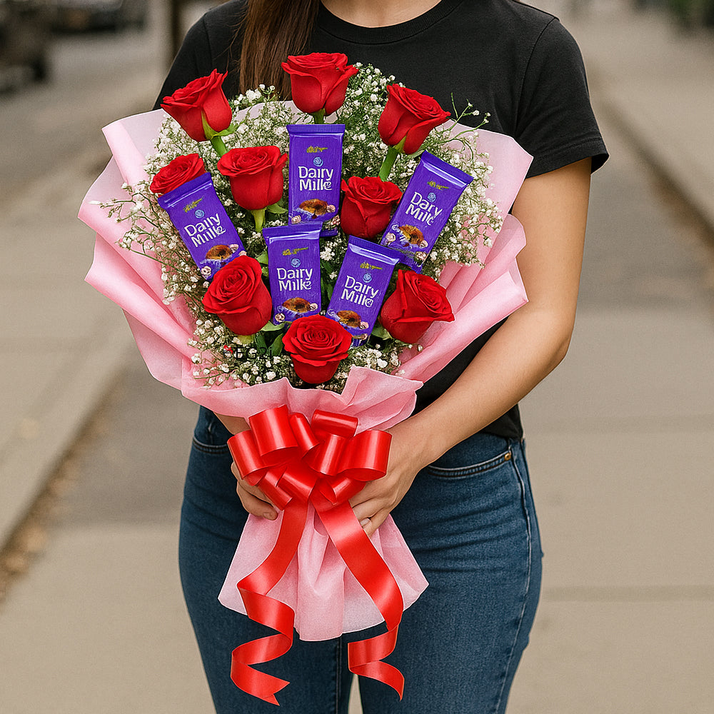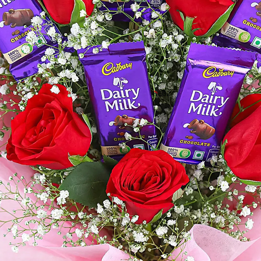 One side hand bouquet of 8pcs Red Roses, And 5pcs dairy Milk chocolates each 13gm.