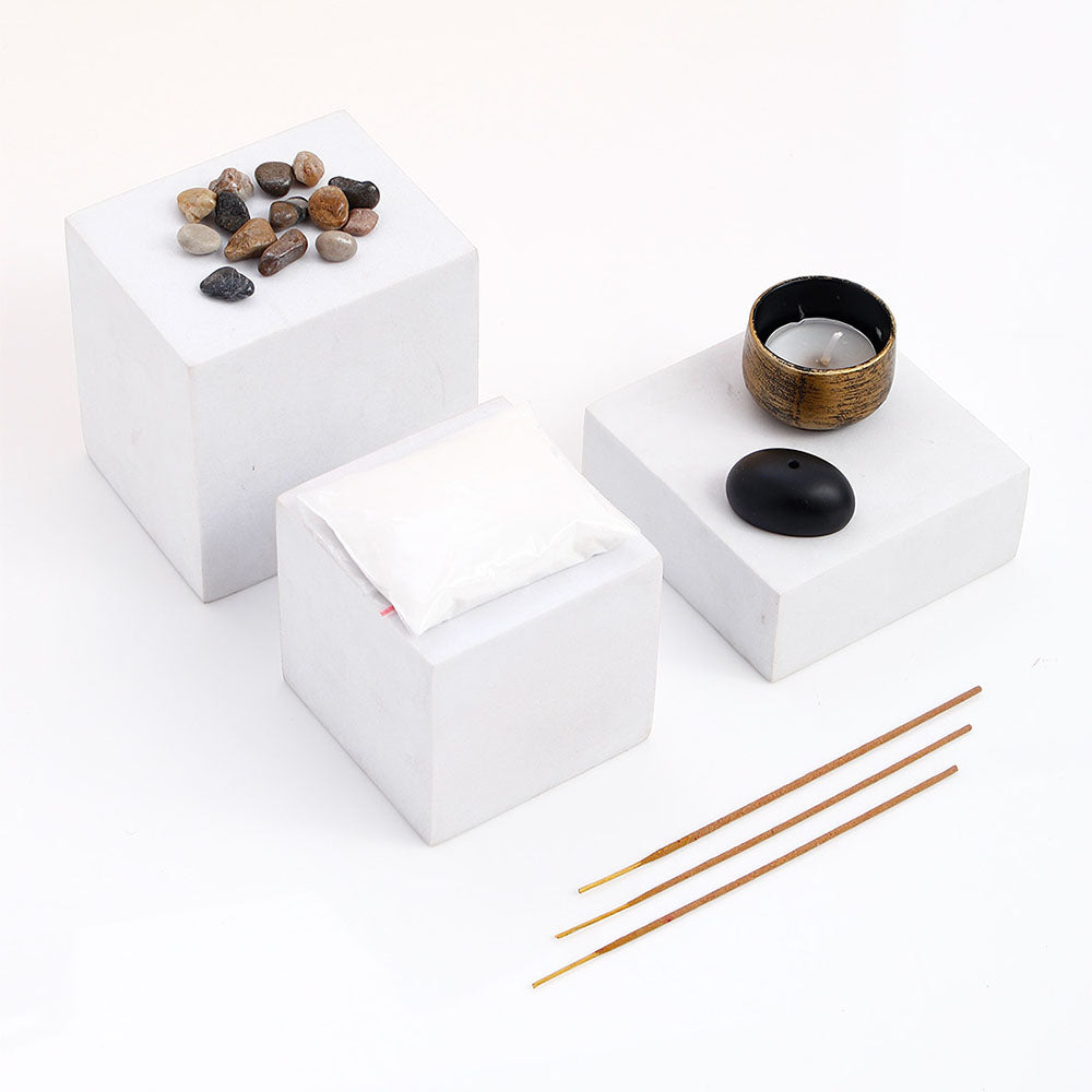 • Complete meditation set including a figurine, candle holder, incense holder, and decorative pebbles for a holistic wellness experience.