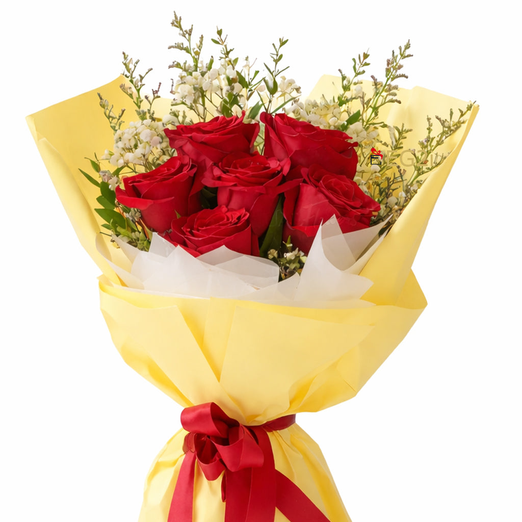 One Side Bouquet of 8pcs Red Roses with Greenary White and Yellow paper wrapping with Red ribbon bow.