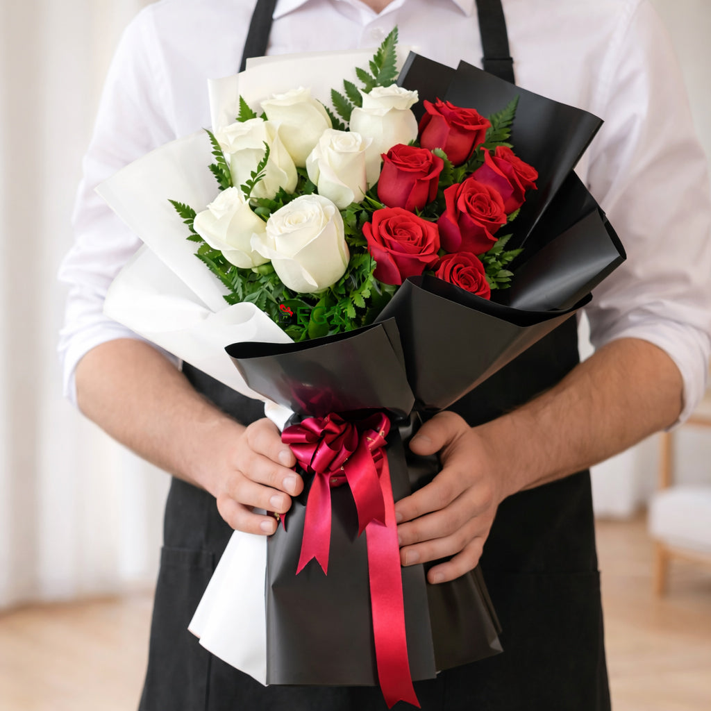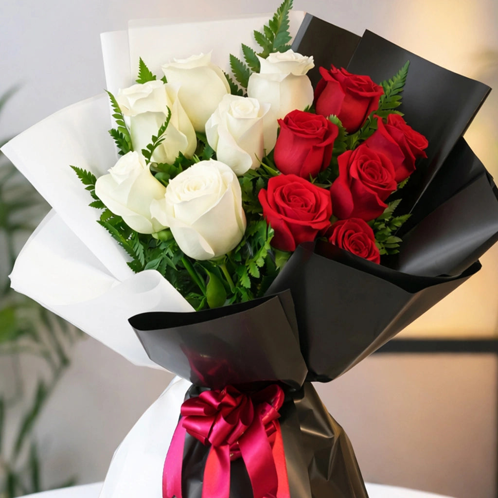 One Side Bouquet of 12pcs Red and White Roses with Greenary Black and White paper wrapping with Red ribbon bow.