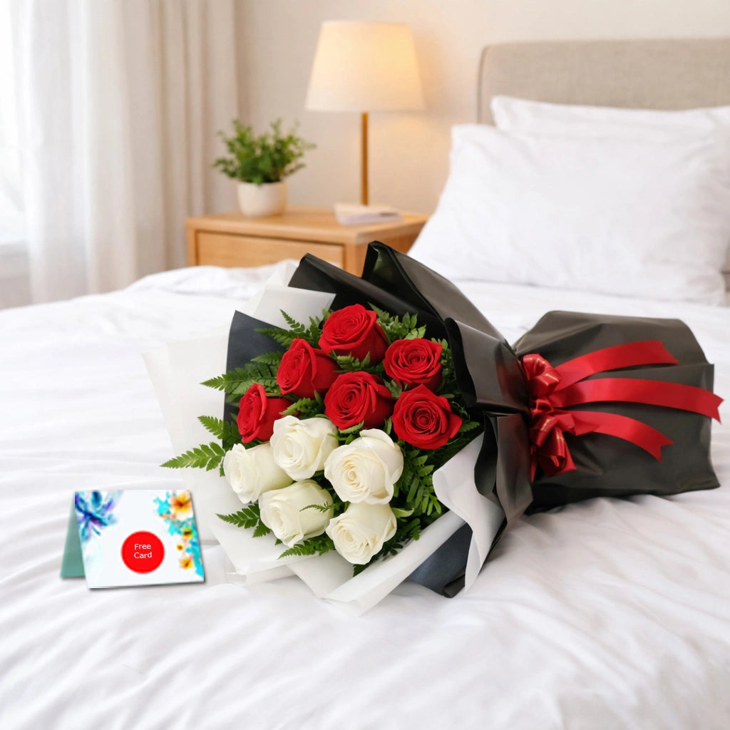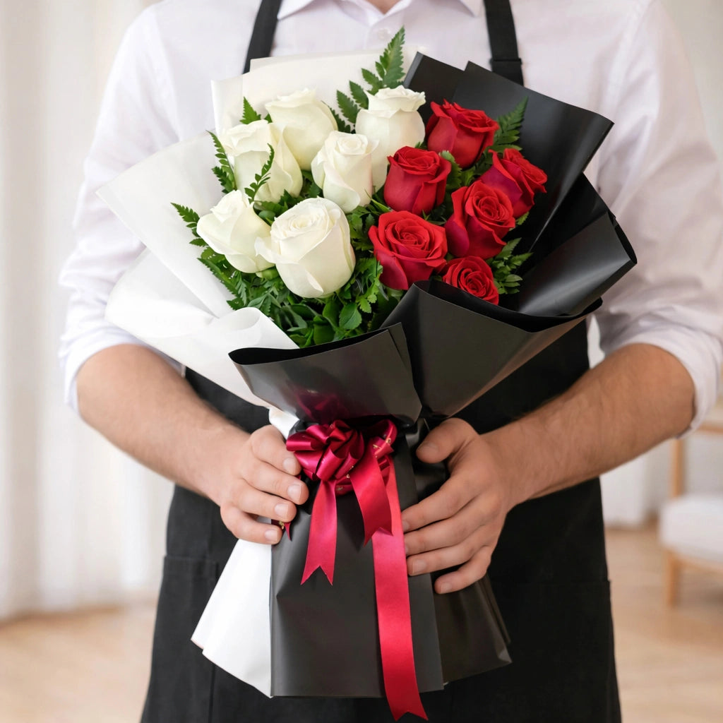 Product Details:: One Side Bouquet of Red and White Roses. One Side Bouquet of 12pcs Red and White Roses with Greenary Black and White paper... Read More