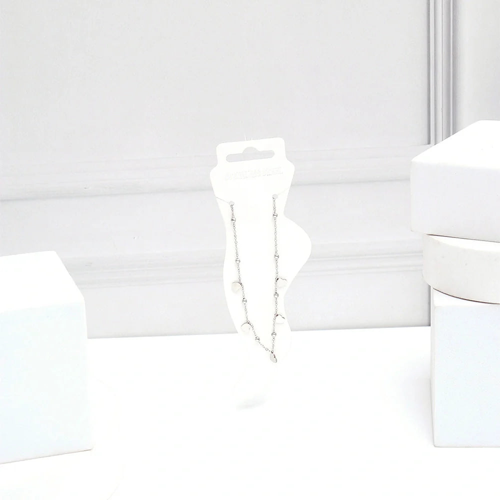 Add a touch of elegance to your ankle with our delicate charm anklets featuring adorable charms and polished beads, the perfect Valentine's gift for a girlfriend or Valentine's gift for a wife who loves dainty, feminine jewelry. These beautiful anklets showcase a fine chain adorned with multiple dangling charms, including open heart outlines, solid heart charms, and polished spherical beads, creating a playful yet sophisticated look. Each anklet features an adjustable chain with an extension and a secure clasp closure, ensuring the perfect fit for any ankle size. Available in a lustrous silver-tone finish, these versatile pieces complement any outfit from casual beachwear to elegant evening attire. The lightweight design ensures comfortable all-day wear whether you're at the beach, attending a summer wedding, or simply adding a feminine touch to your everyday style.