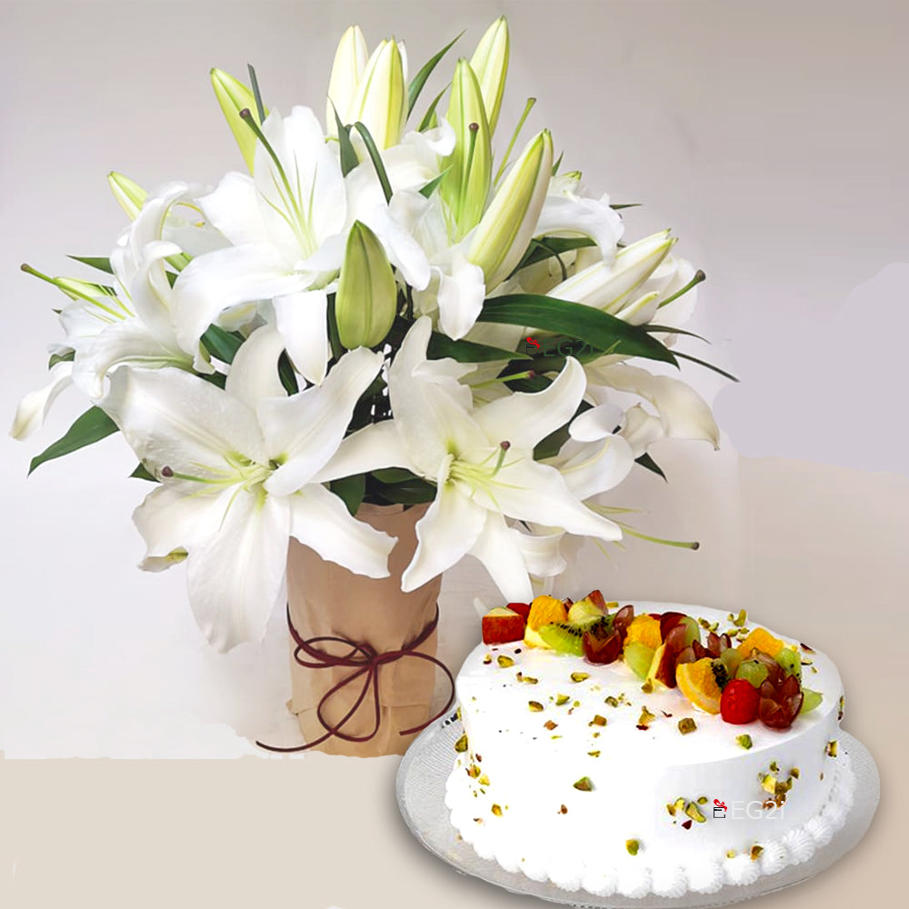The freshness of lilies and the elegance of Fresh fruit cake is an elegance of gifts. Send this exclusive Lilies and Cake Hamper to your loved one anywhere in India for his/her birthday, anniversary, Valentine's Day, Mother's Day, etc.