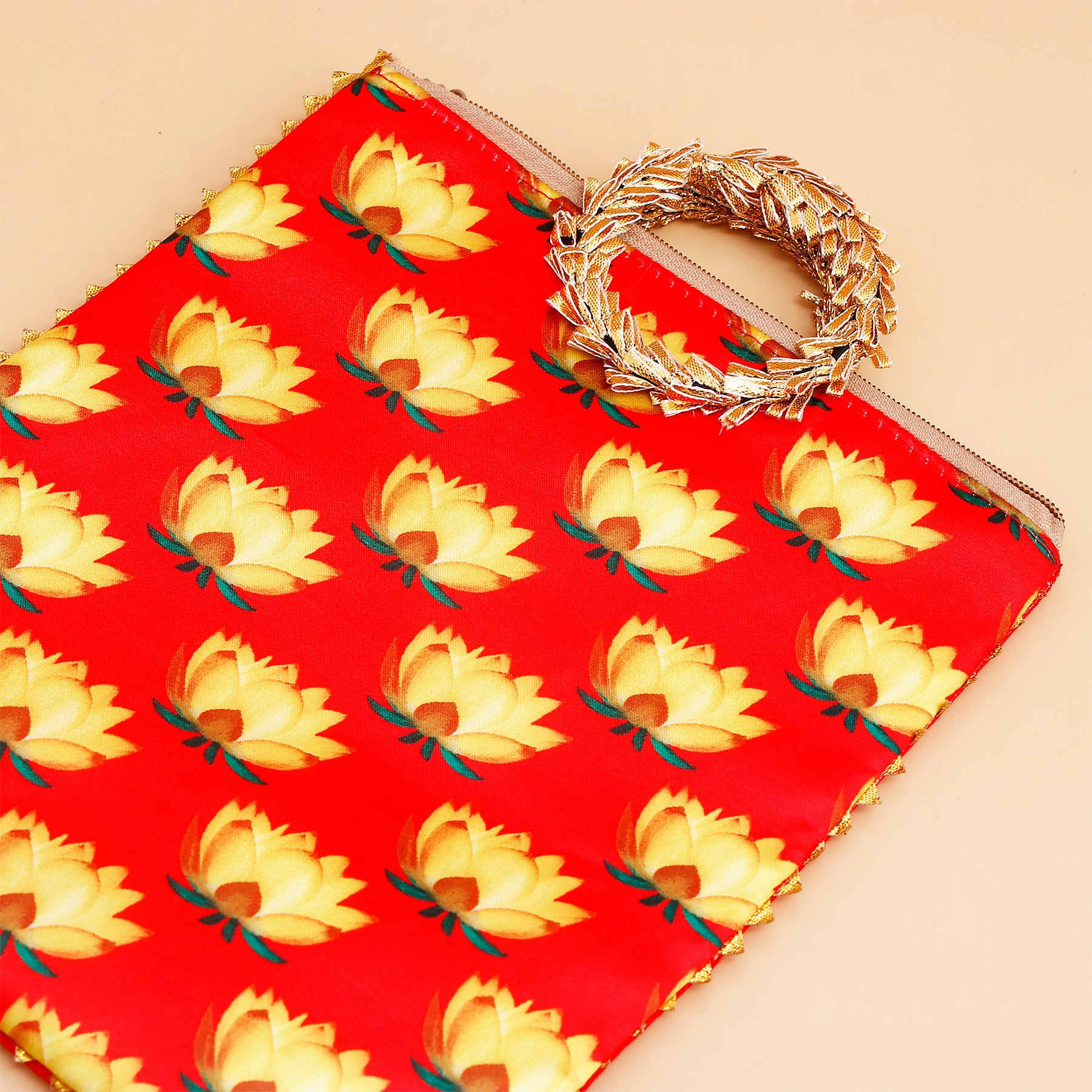 Lotus Printed Ethnic Handcrafted Zip Up Fabric Bag - Red