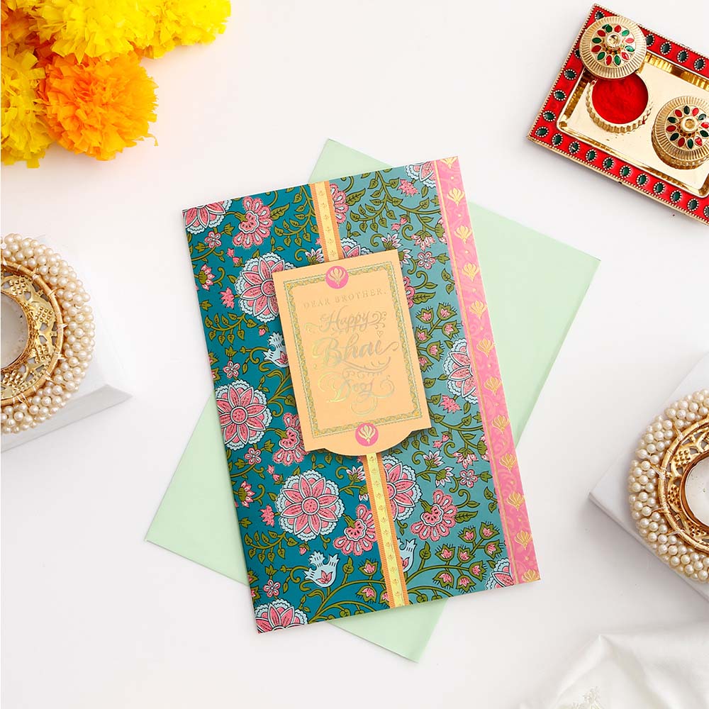 • Bhai Dooj Special Greeting Card - Beautifully designed card with Bhai Dooj motifs and traditional elements.