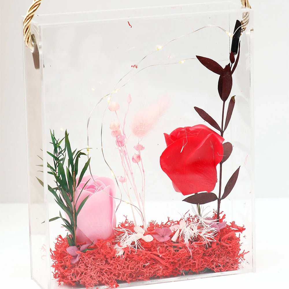 Transform any space into a romantic sanctuary with our enchanting LED floral display boxes, the perfect Valentine's gift for a girlfriend or a wife. These stunning transparent acrylic frames feature beautiful artificial roses, decorative elements, and warm LED fairy lights, creating a mesmerizing display that combines the timeless beauty of Valentine's roses with modern elegance. Each piece is carefully handcrafted with artistic arrangements of flowers, foliage, and decorative accents, making them ideal as Valentine's Day gifts. The convenient golden twisted rope handle allows you to hang these beauties on walls or doors or display them on shelves and tables as captivating centerpieces. The LED lights add a magical glow that makes these pieces stunning both day and night, making them exceptional romantic birthday gifts for him to give her or a thoughtful gift for loved ones on any special occasion.