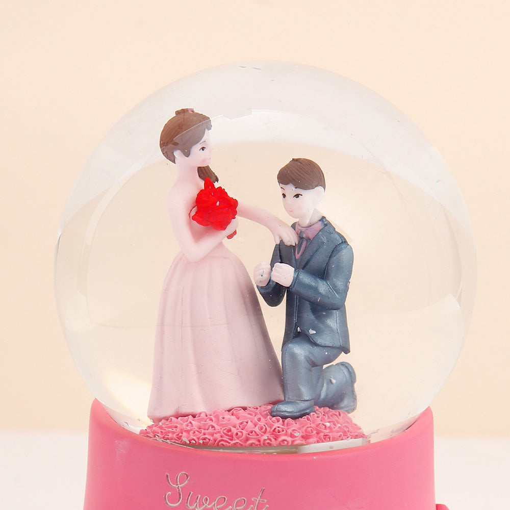 Celebrate eternal love with this enchanting musical snow globe featuring a romantic couple. This mesmerizing decorative piece combines elegance and nostalgia, with delicate snowflakes swirling around the couple figurines as they play a beautiful melody. The ornate golden base, adorned with floral motifs and sparkling details, adds a touch of luxury to any space. Perfect as wedding anniversary gifts for couples, romantic gifts for wives, or anniversary gifts for husbands. An ideal choice for anniversary gifts for her or him, this snow globe creates magical moments. Available for online gift delivery across India.