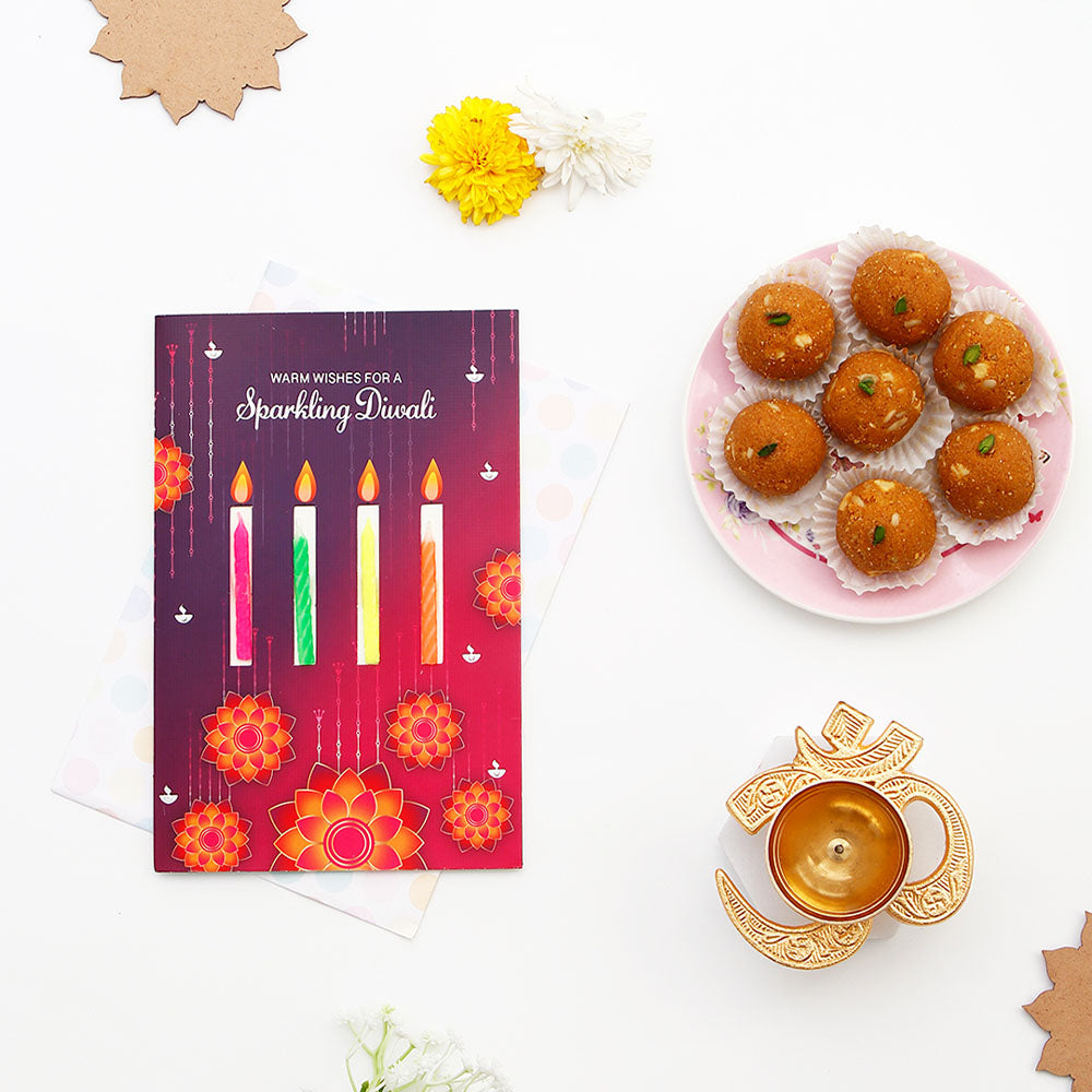 Celebrate the Festival of Lights with our divine Decorative Diya Gift Set, a perfect fusion of tradition, heartfelt emotions, and sweet indulgence. This exquisitely curated gift combines the spiritual glow of a handcrafted diya, the personal warmth of a festive greeting card, and the delectable taste of authentic Indian sweets, making it an ideal gift that embodies the true essence of Diwali celebrations.