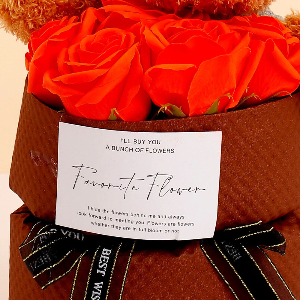 Gift someone special a moment they'll never forget. This enchanting gift box features a soft, huggable brown teddy bear nestled with beautiful artificial roses, elegantly presented in a rich brown textured box tied with a gold-trimmed "Best Wishes" ribbon. These premium artificial roses are crafted to look strikingly lifelike with realistic petals and rich vibrant colors - staying beautiful forever without any watering or maintenance. A heartfelt message card adds a personal touch, making this a truly complete and thoughtful gift. Comes ready to gift in an elegant pink carry bag with a transparent window.