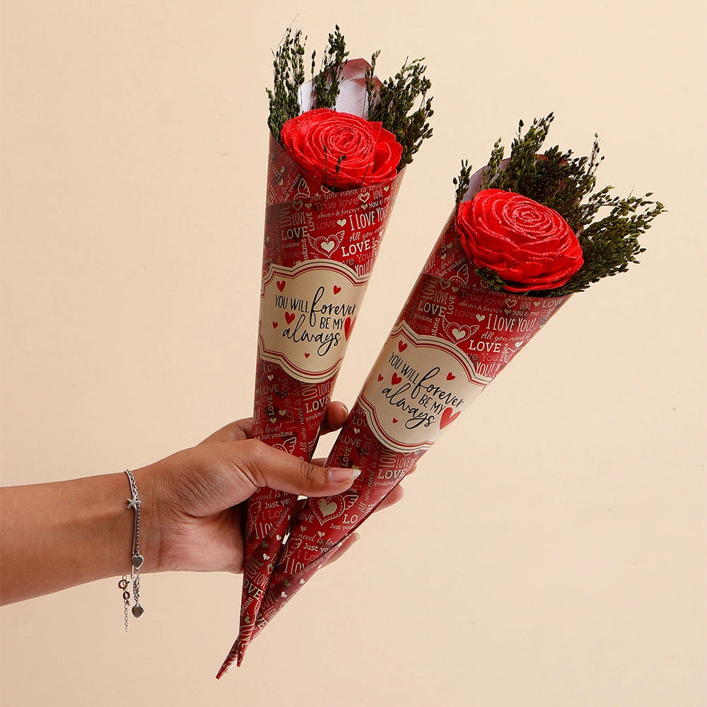 Express your heartfelt emotions with this exquisite artificial rose beautifully arranged with natural dried foliage in an elegant gift wrapper. This stunning decorative rose combines the timeless symbolism of love with the everlasting beauty of artificial flowers, creating a keepsake gift that never wilts or fades. The vibrant rose features realistic petals with sparkling glitter accents that catch the light beautifully, while the natural dried greenery adds organic texture and rustic charm to the arrangement. Presented in a charming red and cream cone wrapper adorned with romantic love-themed typography and the touching message "You Will Forever Be My Always," this ready-to-gift bouquet captures romance and sentiment in one perfect package. Perfect for anniversaries, birthdays, romantic gestures, appreciation gifts, Valentine's Day, Women's Day, proposals, apologies, celebrations, or simply to brighten someone's day, this elegant floral gift combines convenience with sophistication.