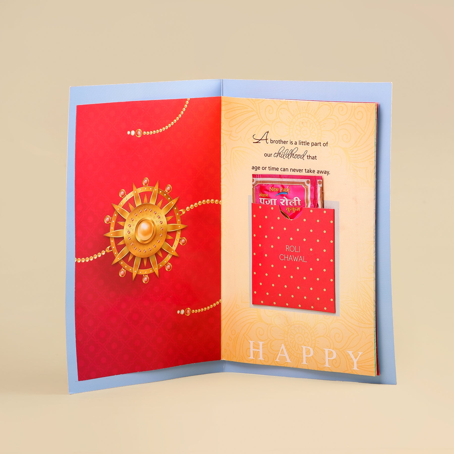 • Neat packaging: Securely holds Rakhi and roli-chawal inside the card.