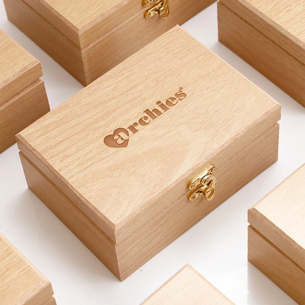 5. Wooden Gift Box - Laser-engraved Archies logo presentation box with golden clasp