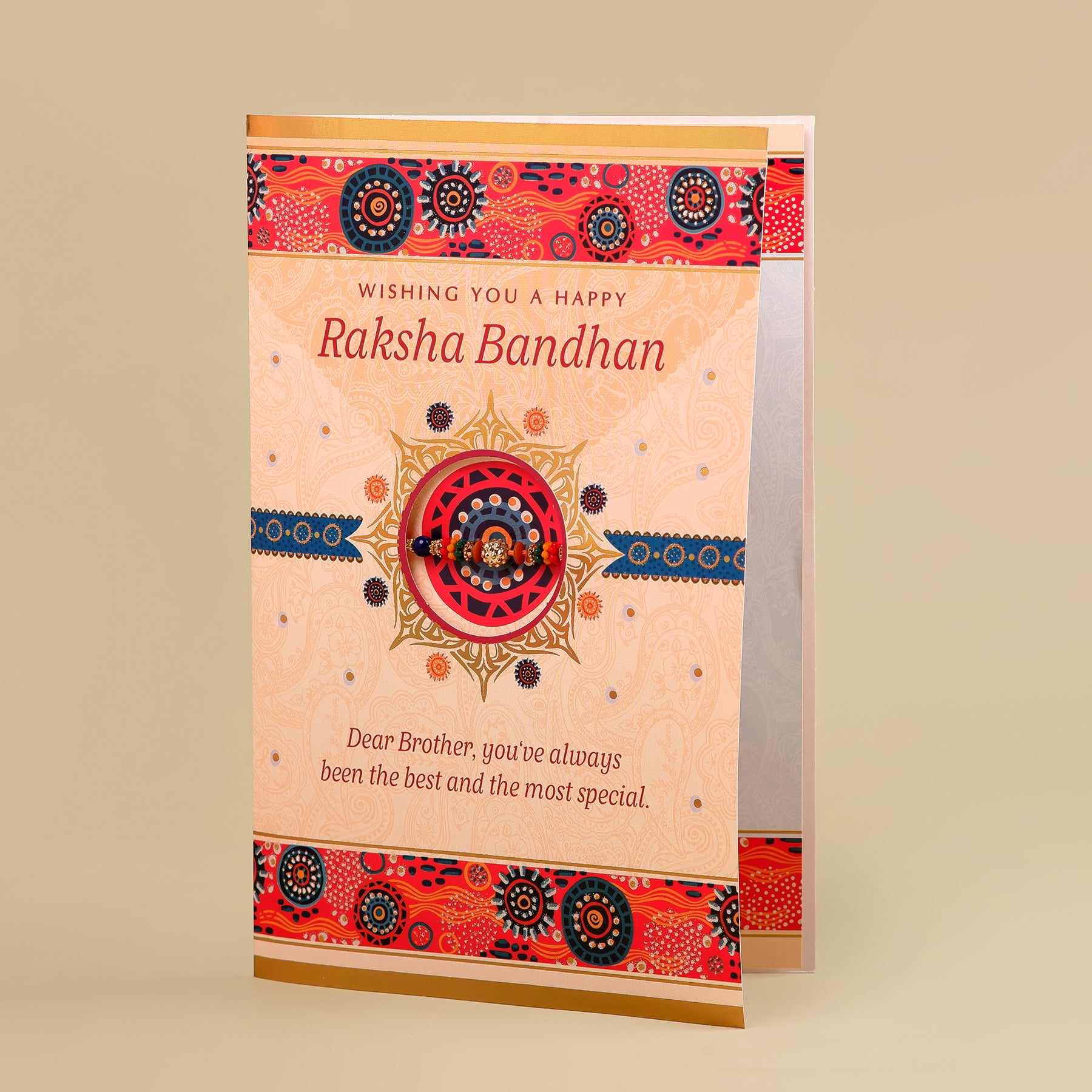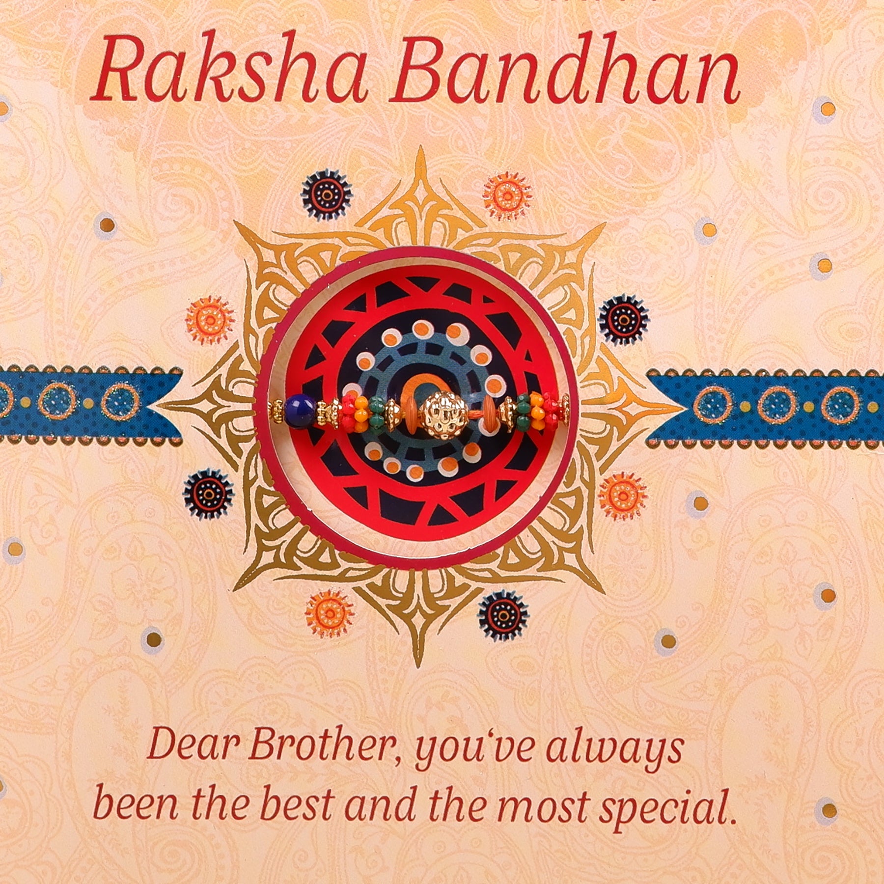 Celebrate the cherished bond between siblings with our exclusive Greeting Card with Rakhi set, thoughtfully curated to make Raksha Bandhan extra special. This amazing set includes a beautifully crafted Rakhi, an elegantly designed greeting card, and traditional roli chawal, ensuring a complete and heartfelt celebration.