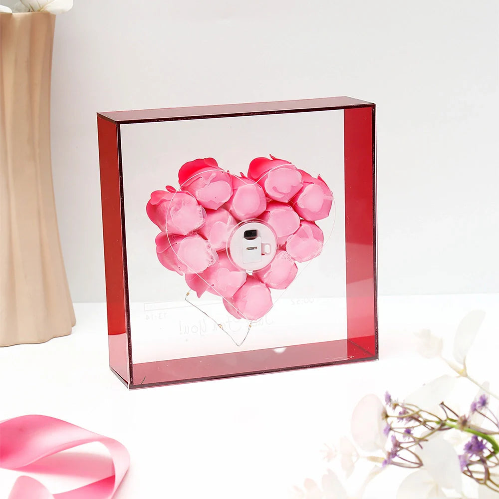 Transform any space into a romantic sanctuary with our enchanting LED floral display boxes, the perfect Valentine's gift for a girlfriend or a wife. These stunning transparent acrylic frames feature beautiful artificial roses, decorative elements, and warm LED fairy lights, creating a mesmerizing display that combines the timeless beauty of Valentine's roses with modern elegance. Each piece is carefully handcrafted with artistic arrangements of flowers, foliage, and decorative accents, making them ideal as Valentine's Day gifts. The LED lights add a magical glow that makes these pieces stunning both day and night, making them exceptional romantic birthday gifts for him to give her or a thoughtful gift for loved ones on any special occasion.