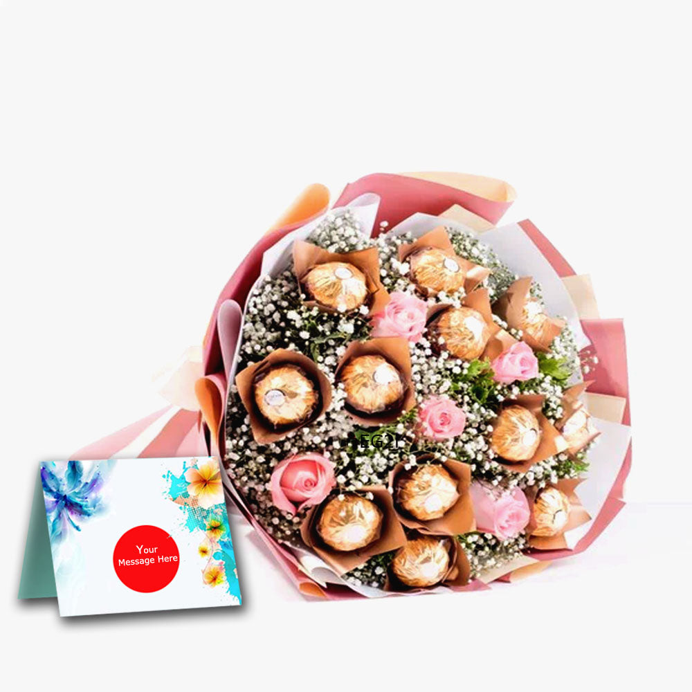 A bouquet of pink roses paired with chocolates is a delicate and thoughtful gift, blending the softness of affection with the sweetness of indulgence. The pink roses, with their gentle hues, symbolize admiration, gratitude, and joy, creating a tender and graceful visual effect. Their layered petals offer an elegant, romantic touch. Mixed with luxurious chocolates—whether truffles, pralines, or assorted chocolate treats—this bouquet appeals to both the heart and the senses. The chocolates add an extra layer of sweetness and surprise, perfect for someone who enjoys the finer things in life. The combination of soft pink roses and rich chocolates creates an uplifting, charming gift for occasions such as birthdays, anniversaries, or as a gesture of appreciation or affection.