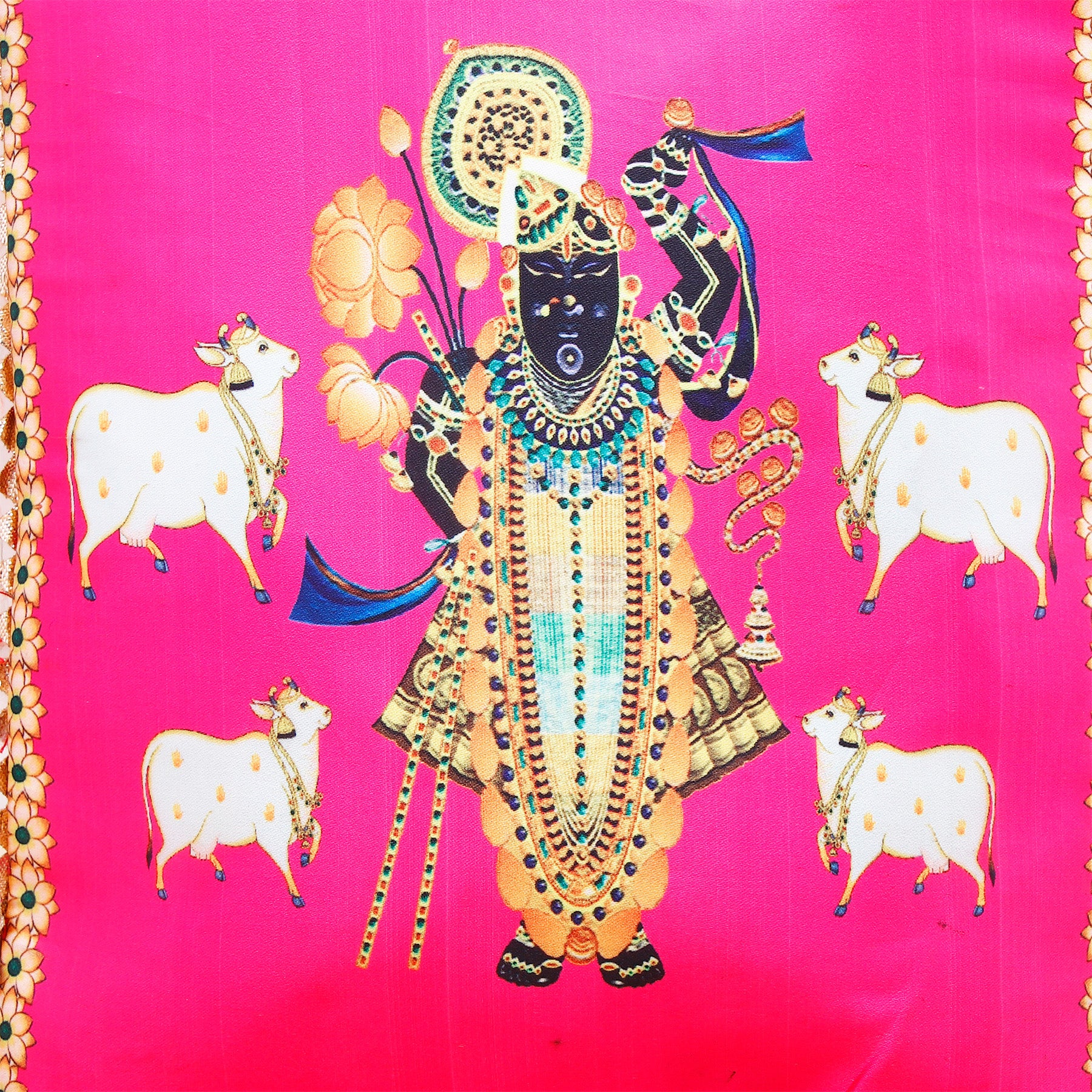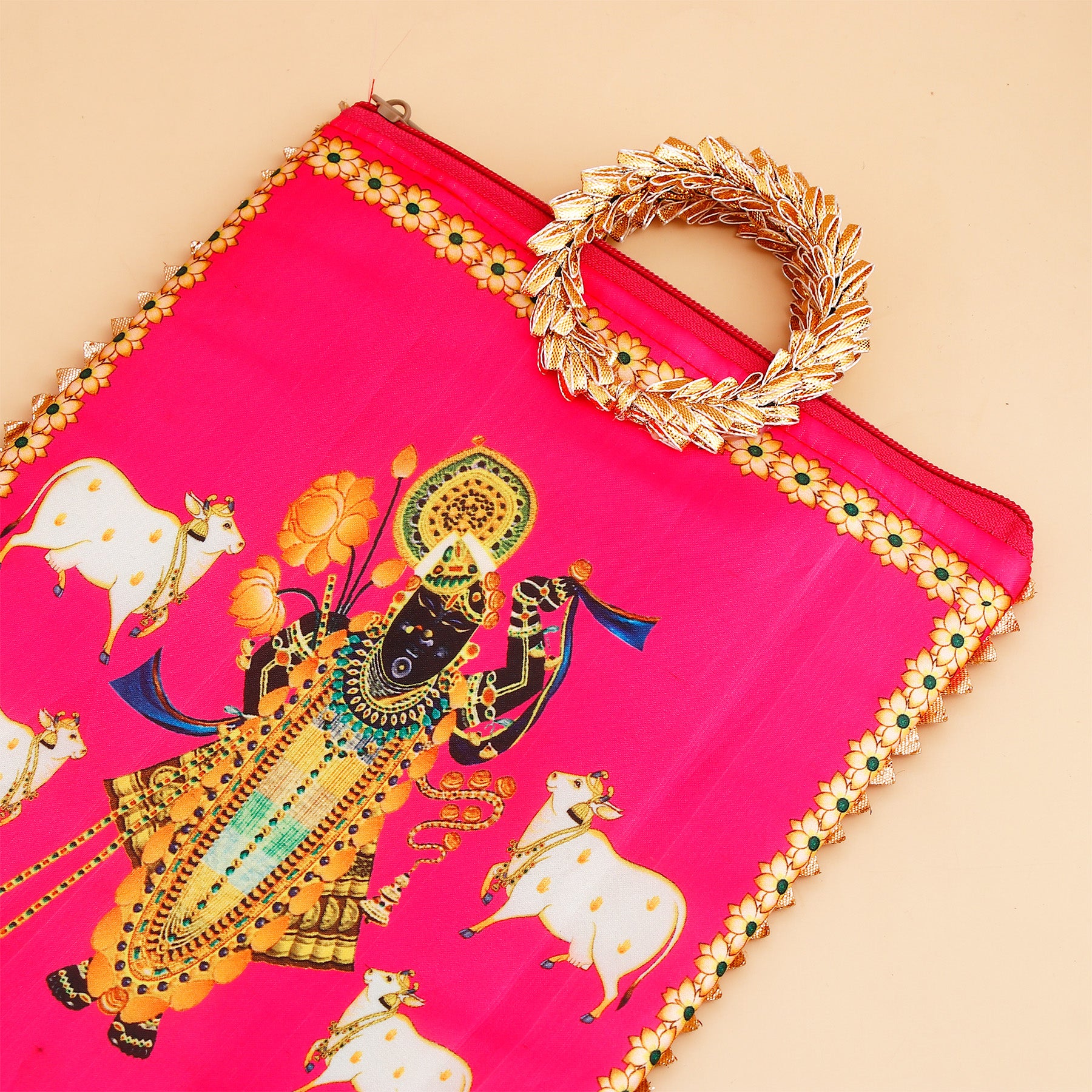Elevate your festive celebrations with this exquisitely designed handcrafted potli bag, blending tradition with elegance. Made from premium fabric, it features vibrant prints inspired by Indian heritage — from divine motifs like Krishna-Radha to auspicious Kamdhenu cow patterns. The intricate bead and pearl-studded handle adds a royal charm, with zip up feature providing pratical and comfortable usage, while the spacious interior is perfect for carrying your essentials in style.