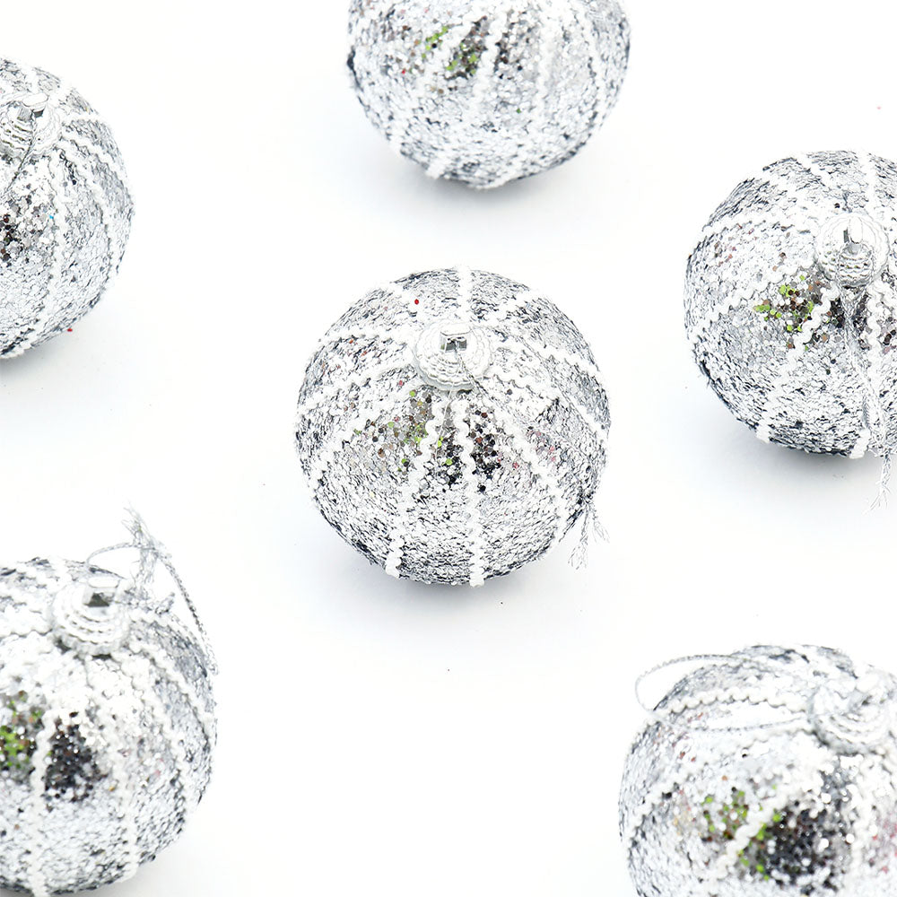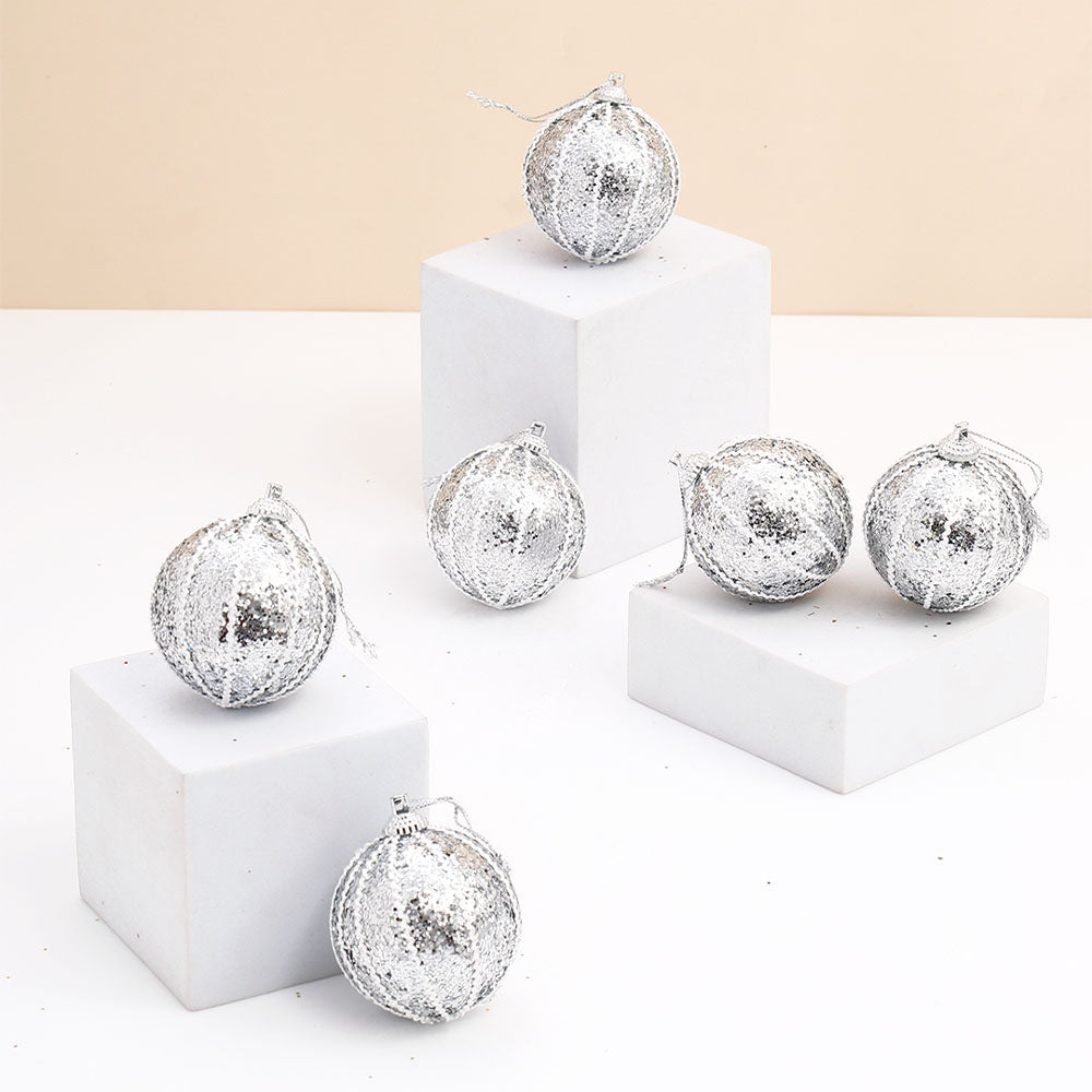 • Elegant Design: Includes a mix of glittery baubles, mini gift boxes, and textured ornaments in shimmering silver and white hues.