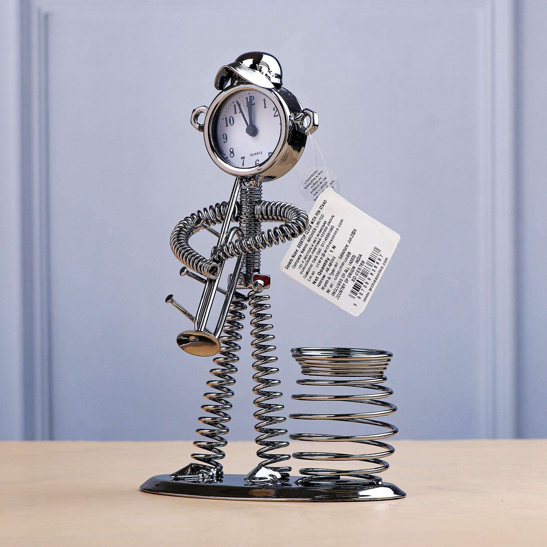 Elevate the elegance of your workspace or home decor with our exquisite Stainless Steel Showpiece, featuring a built-in clock and pen stand.