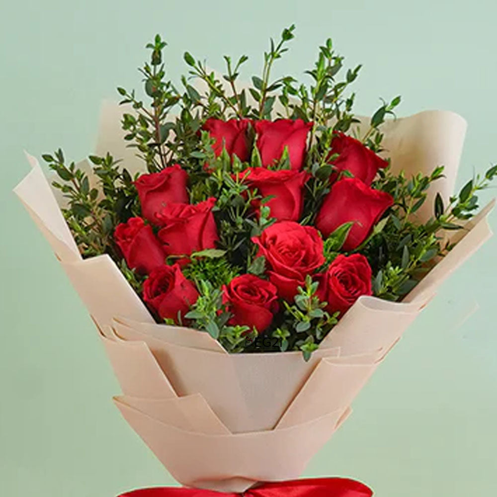 A bouquet of red roses is a timeless and classic symbol of love, passion, and romance. The deep red petals of the roses, velvety and rich in color, convey deep emotions, often representing love, admiration, and respect. The simple elegance of red roses, when arranged together, creates a striking and romantic visual impact. This bouquet can vary in size, from a small, intimate gathering of a few perfect blooms to a grand and luxurious arrangement filled with dozens of roses. The fragrance of the roses enhances their beauty, making the bouquet not only visually stunning but also a sensory delight. Perfect for romantic occasions, anniversaries, or as a gesture of affection, a red rose bouquet speaks directly to the heart.