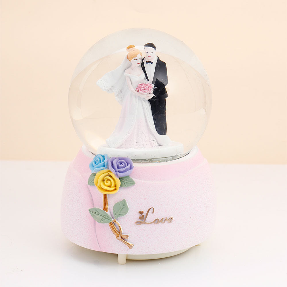 Celebrate eternal love with this enchanting musical snow globe featuring a romantic couple. This mesmerizing decorative piece combines elegance and nostalgia, with delicate snowflakes swirling around the couple figurines as they play a beautiful melody. The ornate golden base, adorned with floral motifs and sparkling details, adds a touch of luxury to any space. Perfect as wedding anniversary gifts for couples, romantic gifts for wives, or anniversary gifts for husbands. An ideal choice for anniversary gifts for her or him, this snow globe creates magical moments. Available for online gift delivery across India.