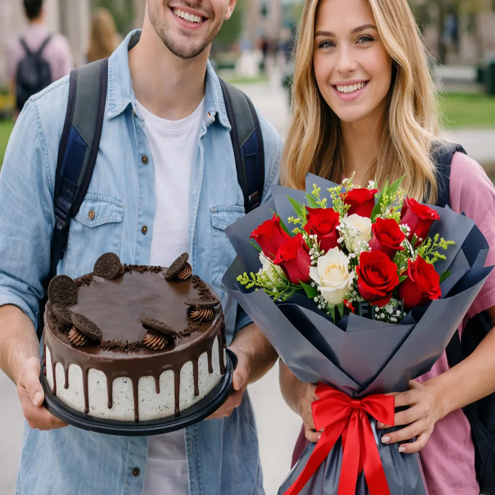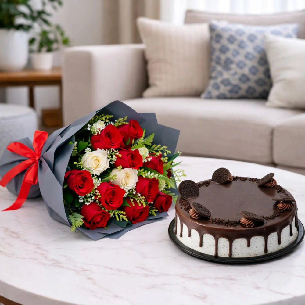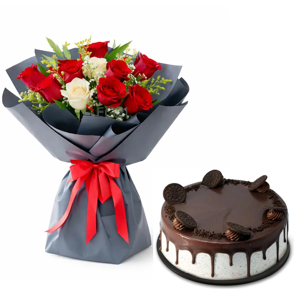 Product Details:: One Side Bouquet of Roses and Cake. One Side Bouquet of 10pcs Red Roses, 2pcs white Roses with Greenary and Black paper wrapping... Read More