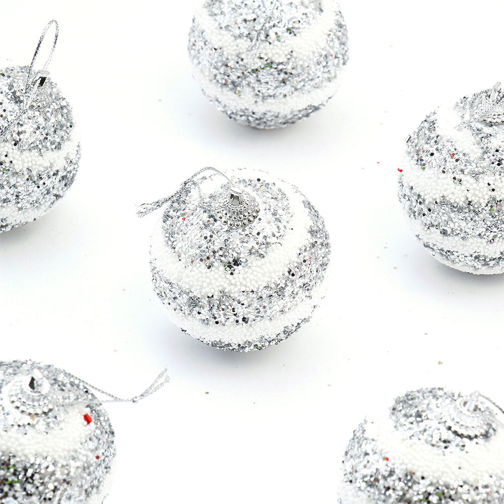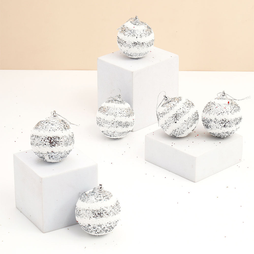 • Elegant Design: Includes a mix of glittery baubles, mini gift boxes, and textured ornaments in shimmering silver and white hues.