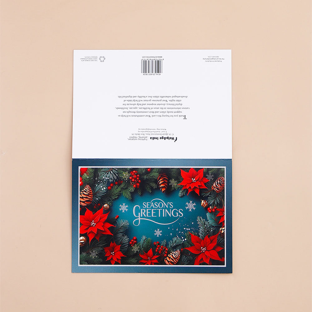 Celebrate Festivals With our beautiful Seasons Greeting Card. This elegant card is perfect for personal messages and wishes. With a beautiful design printed in front, and smooth blank pages inside for you to write heartwarming messages. Its vibrant design and high-quality paper make it a delightful choice for sending warm festive greetings. Whether you are giving it to friends or family, it will surely brighten their day.
