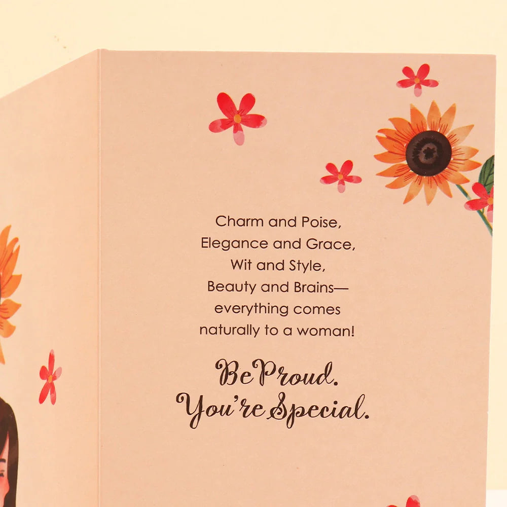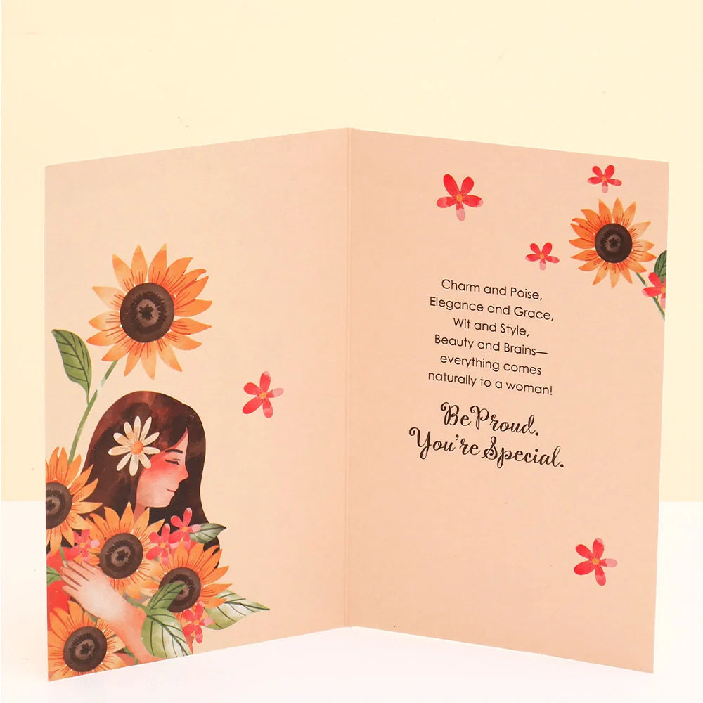 Celebrate strength, grace, and inspiration with our beautifully designed Women's Day Greeting Card paired with a premium fragrance for a truly elegant surprise. Thoughtfully curated to honor the incredible women in your life, this special combo blends a heartfelt greeting card with a delightful perfume to make every wish feel extra meaningful. Crafted from premium-quality paper with inspiring themes and heartfelt messages, each card perfectly complements the long-lasting fragrance, creating a sophisticated gift that speaks from the heart.